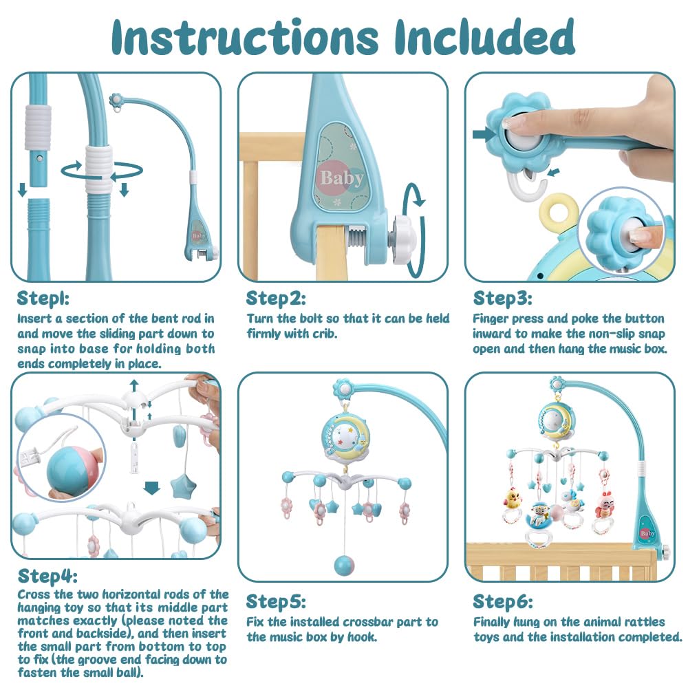- Musical Mobile - Four modes of soothing music-150 soft lullabies,10 musical organ,6 baby song and 5 nature sounds in the musical box.With adjustable volume,Need to keep long press