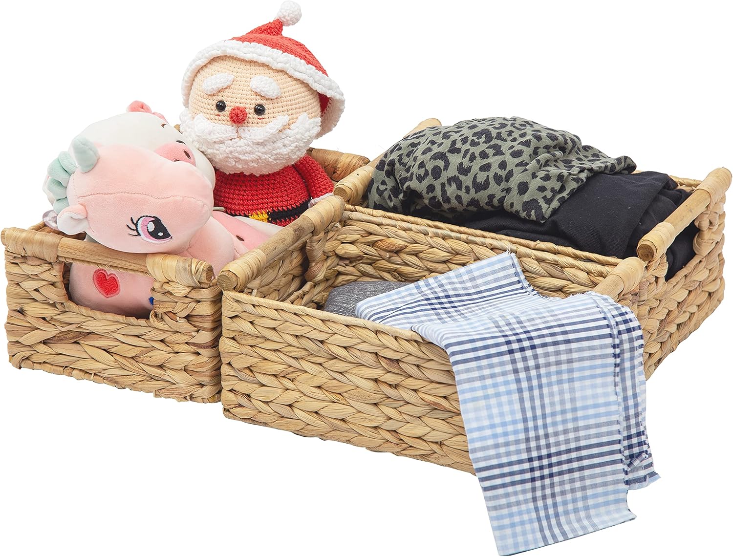 - ✅ Natural & High Quality - Our small rectangle basket storage are made of Water Hyacinth, an all-natural and easily renewable resource with an iron frame for sturdy storage. The wooden handles on both sides are not only pretty but to help you easy to carry the wicker basket.