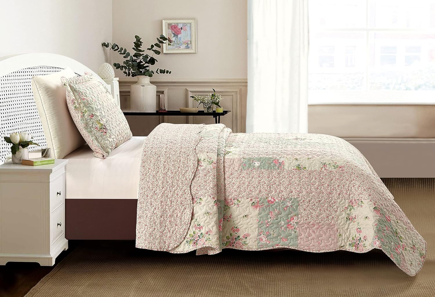 Brilliant Sunshine Rose and Sage Quilt Set, 2-Piece Bedding Sets, Traditional Patchwork Design, Washable and Reversible Bedspread, Soft Lightweight Coverlet, All-Season, Twin/Twin XL, Light Pink Green