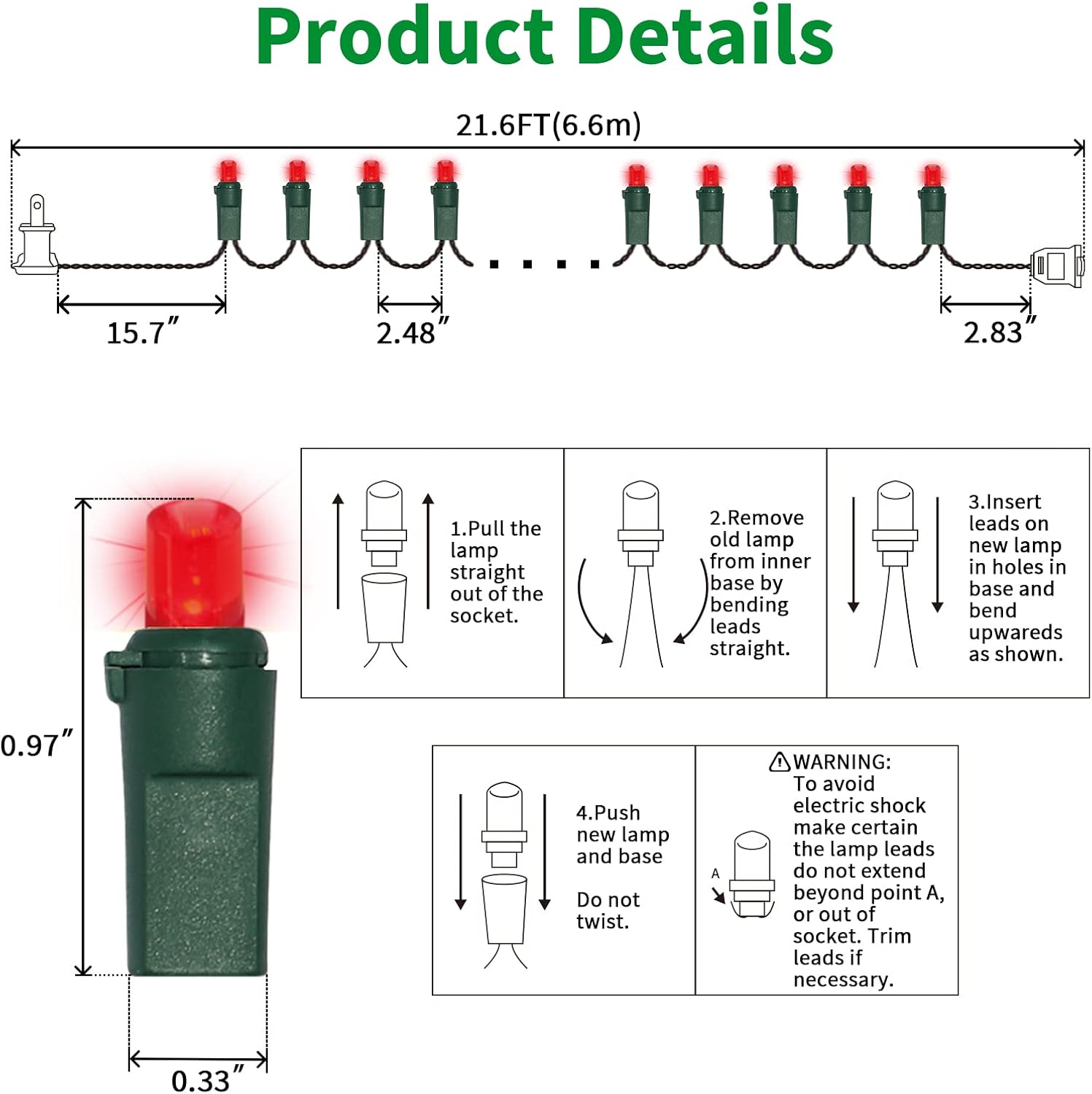 • 5mm LED Christmas Lights: 100 counts warm white 5mm wide angle stable LED string lights spaced 6.3 inches apart with green wire. 7.1 inch leads have a stackable male plug and 5.9 inch tails have a female plug for easy end to end connection.