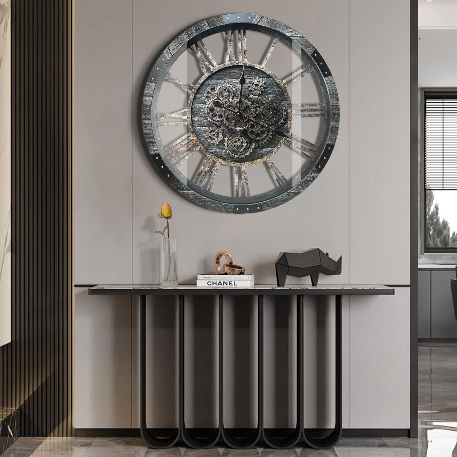 DORBOKER 27" Real Moving Gears Large Wall Clock with Toughened Glass Cover, Giant Wood Farmhouse Clock, Oversized Vintage Industrial Rustic Clock for Living Room Decor Home Kitchen (Carbon Grey)