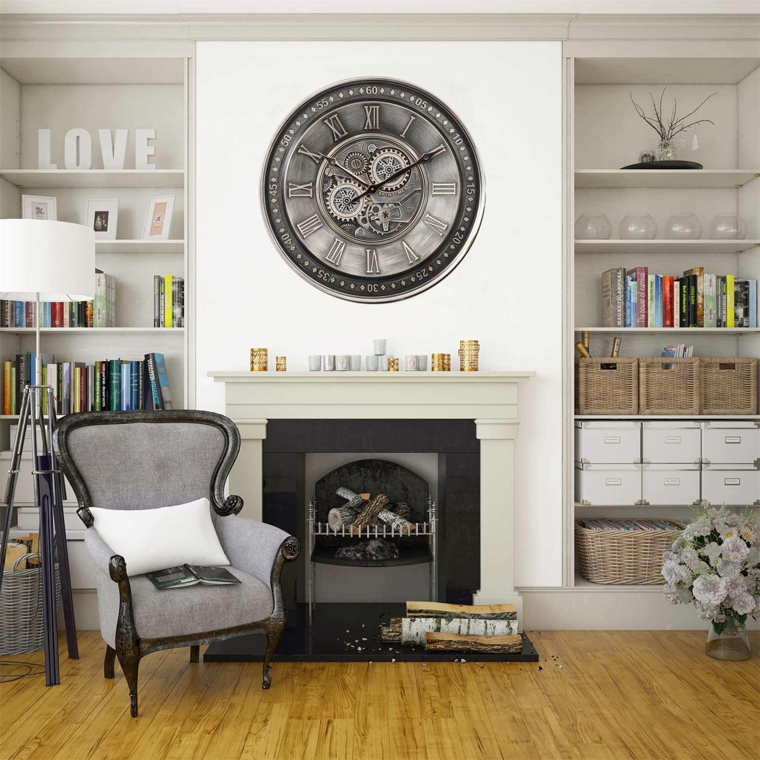 CLXEAST 24 Inch Large Moving Gear Wall Clock for Living Room Decor, Antique Silver Metal Roman Numerals Wall Clocks for Home Office