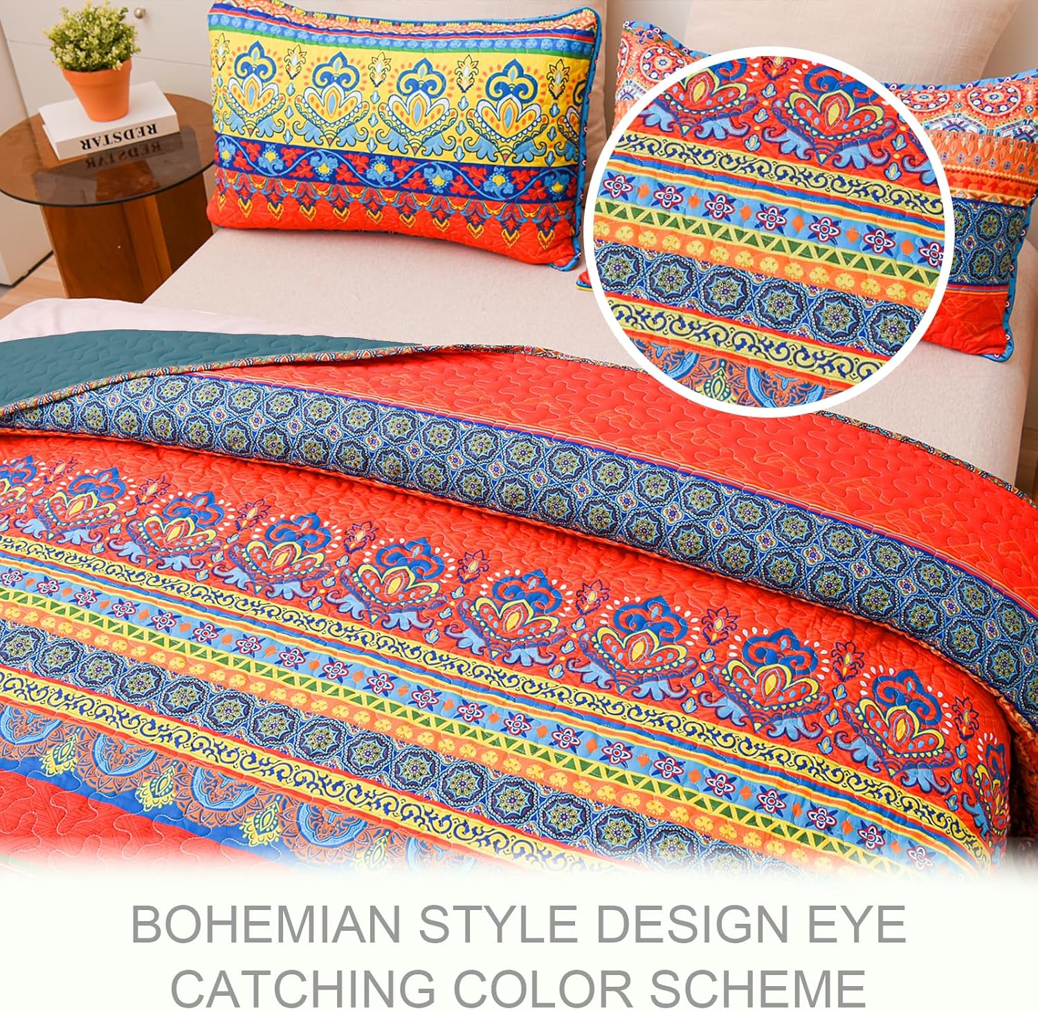- Design: Pastel bohemian patterns are carefully printed on this quilt bedding set. Thanks to the high-tech digital print technology, this bed cover could keep its vibrant colors and patterns from fading after washing