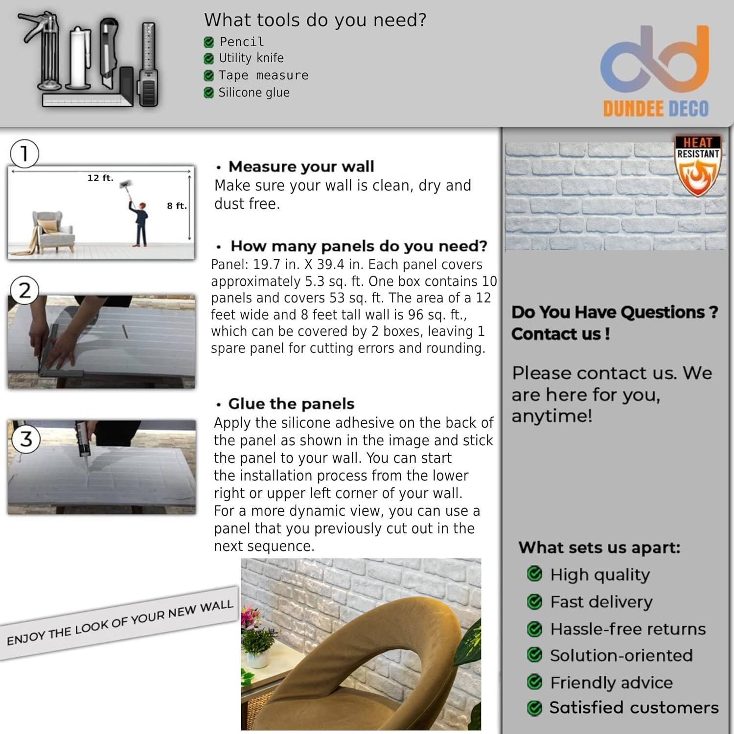 - Covers More Wall in Less Time. Each 3D panel measures 39.4" x 19.7" x 0.80", with a 10-pack covering 53 sq. ft. (for standard height walls, 6 feet wide). Larger size means fewer pieces and quicker installation. Note: Sample panels are 10" x 10".