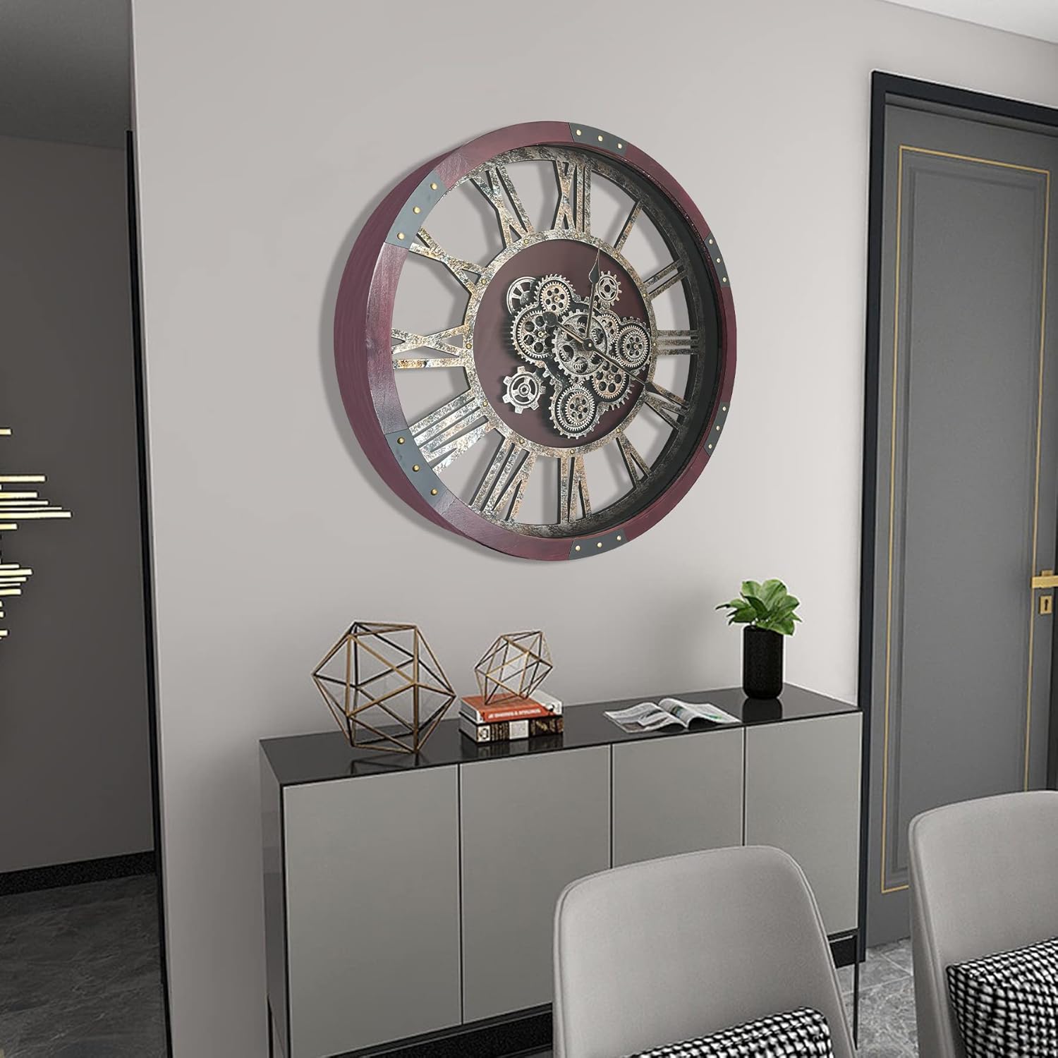 - Real Moving Gears Wall Clock: The large rustic wall clock is design with multi-real moving gears, put battery in, various gears start working, makes a subtle relaxing sound and makes a living element in the environment in where it is placed, vintage and magical, catch all eyes of visits