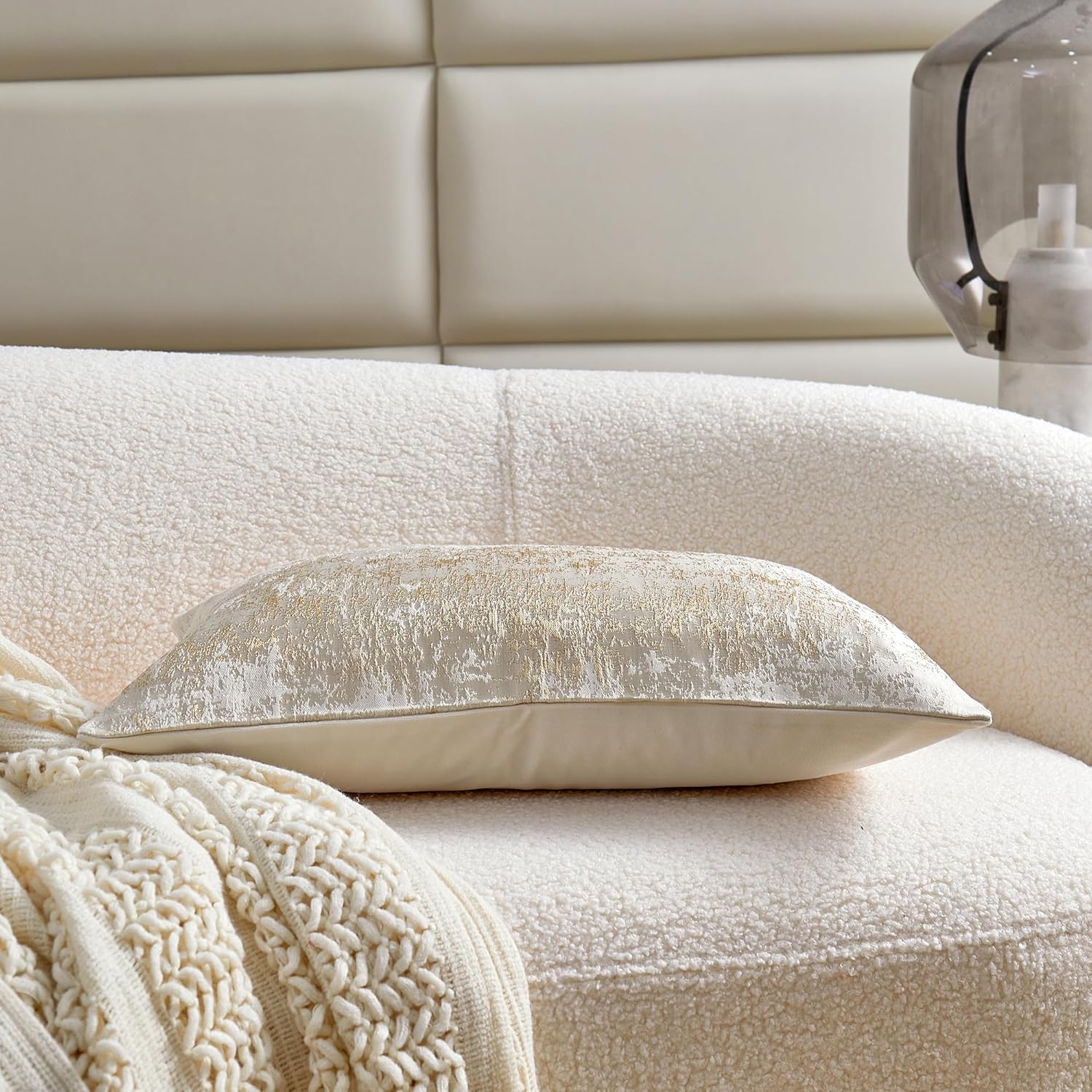 THE-TINOART Cream Beige & Gold Luxury Pillow Cover 12x20 - Embroidered Jacquard with Metallic Thread, Reversible Decorative Throw Pillow Cover for Sofa/Bed, Velvet Backing