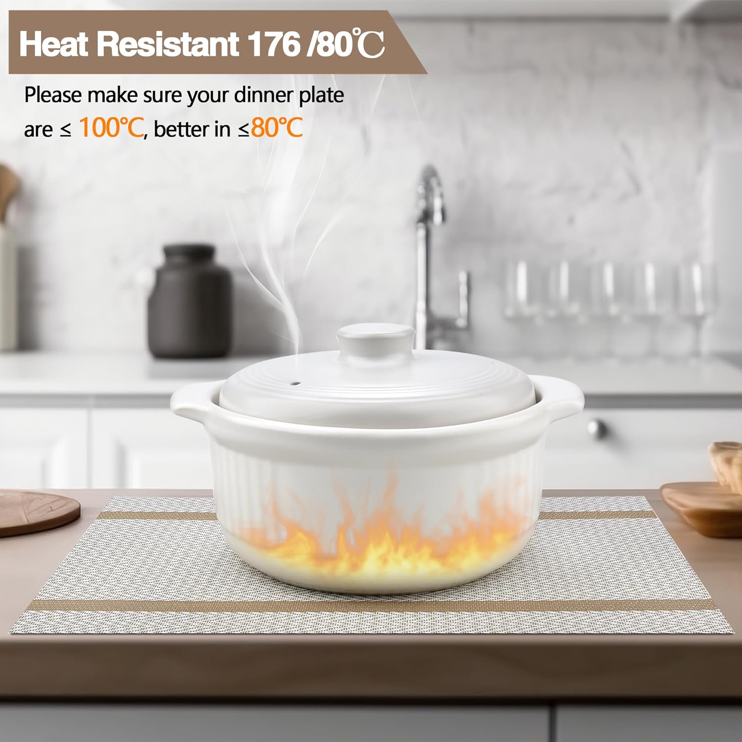 - Heat Resistant: Please make sure your dinner plate are ≤ 100℃, better in ≤80℃. It can prevent the table from slipping and scalding the countertop. These beautiful stylish vinyl place mats to add more fun to your dining table