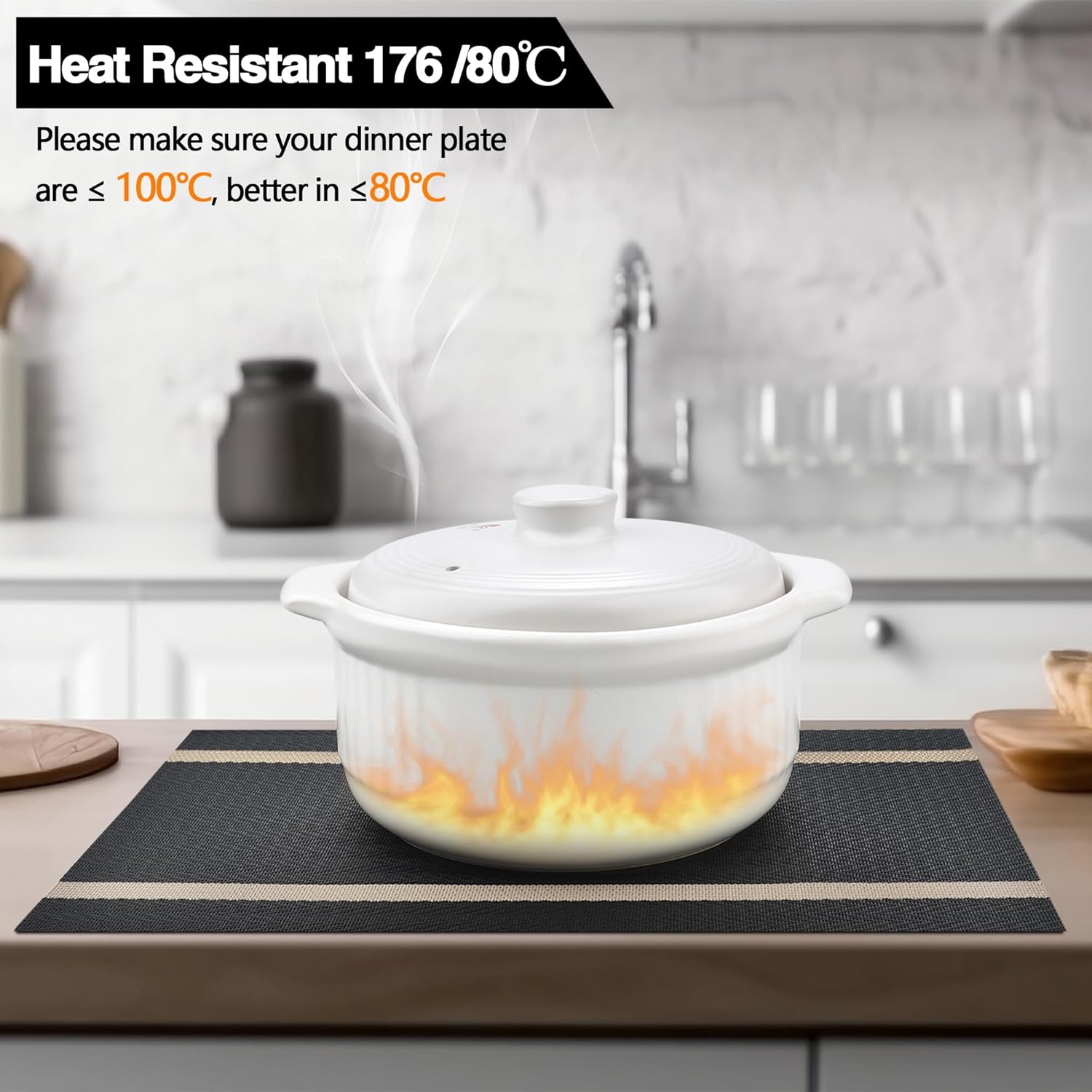 - Heat Resistant: Please make sure your dinner plate are ≤ 100℃, better in ≤80℃. It can prevent the table from slipping and scalding the countertop. These beautiful stylish vinyl place mats to add more fun to your dining table