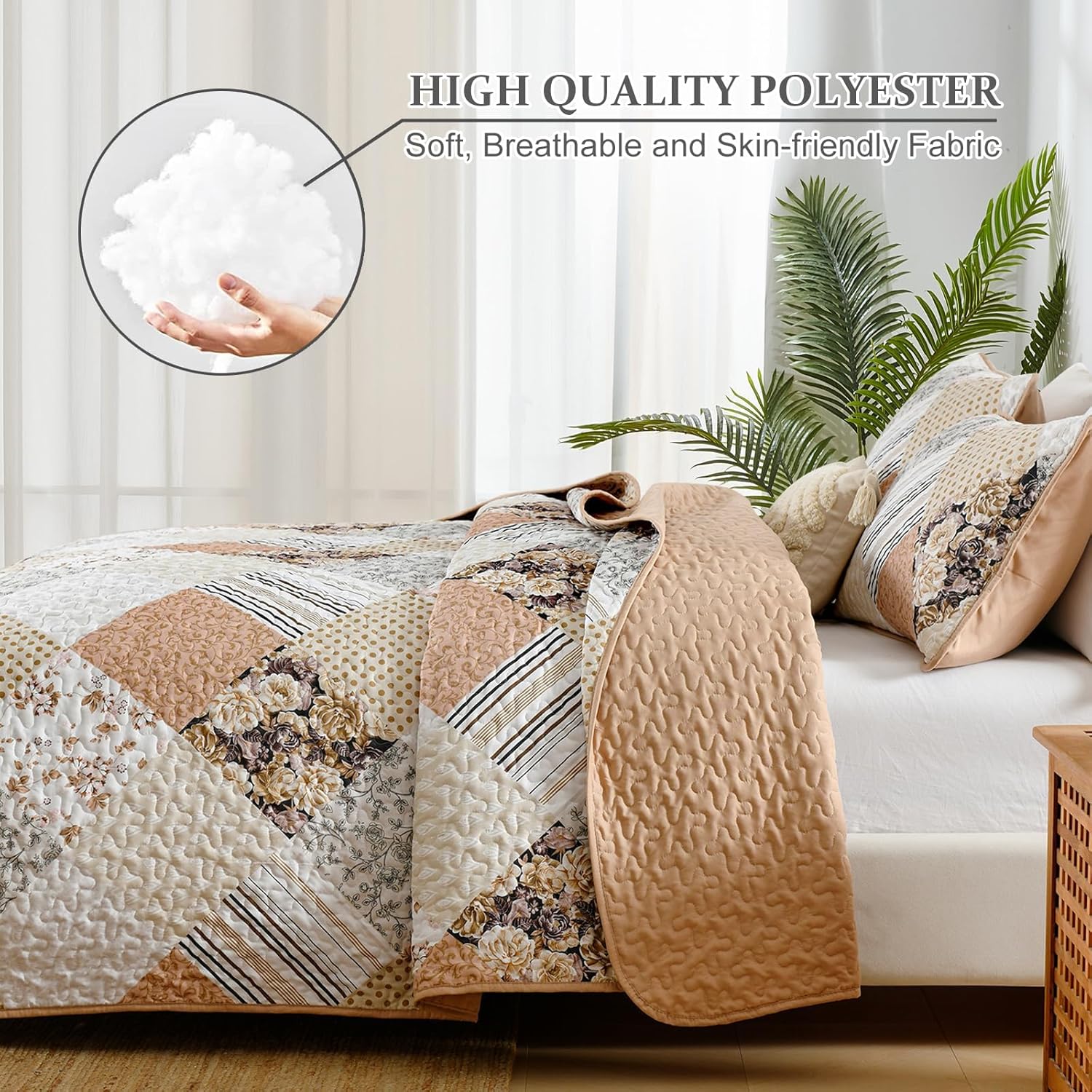 - FALL QUILT SETS: This beige patchwork floral quilt is filled with high-quality soft polyester. Compared to other materials, it is softer, more breathable and comfortable. Our patchwork quilt sets can bring you a high-density smooth surface, super soft, and makes you never want to leave your bed.