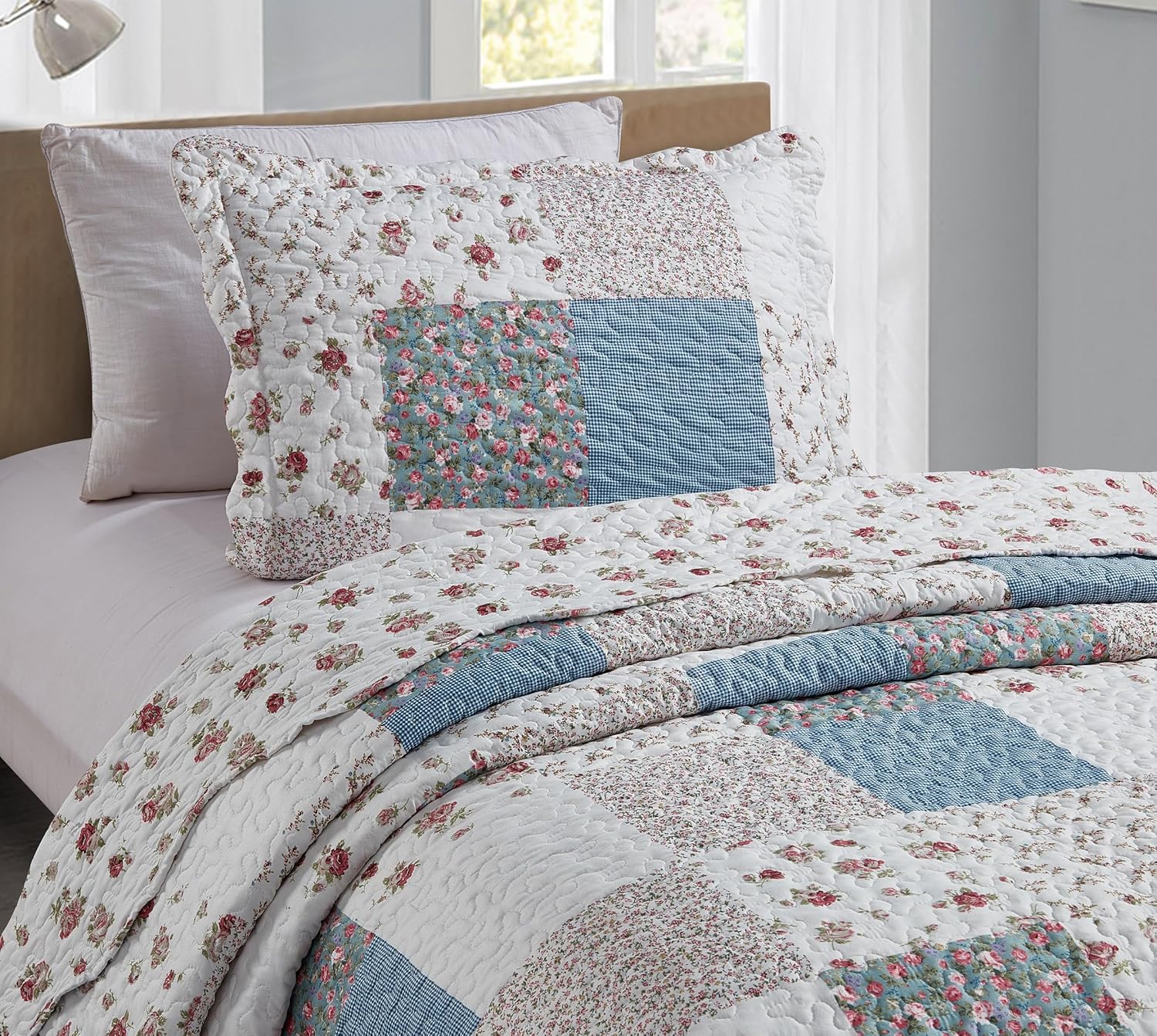 - UNIQUE DESIGN: Pink rose with small blue check patchwork patterns, with vermicelli quilting, gentle, quiet and unique. Reverse to a coordinating rose pattern. Made to enhance decor.