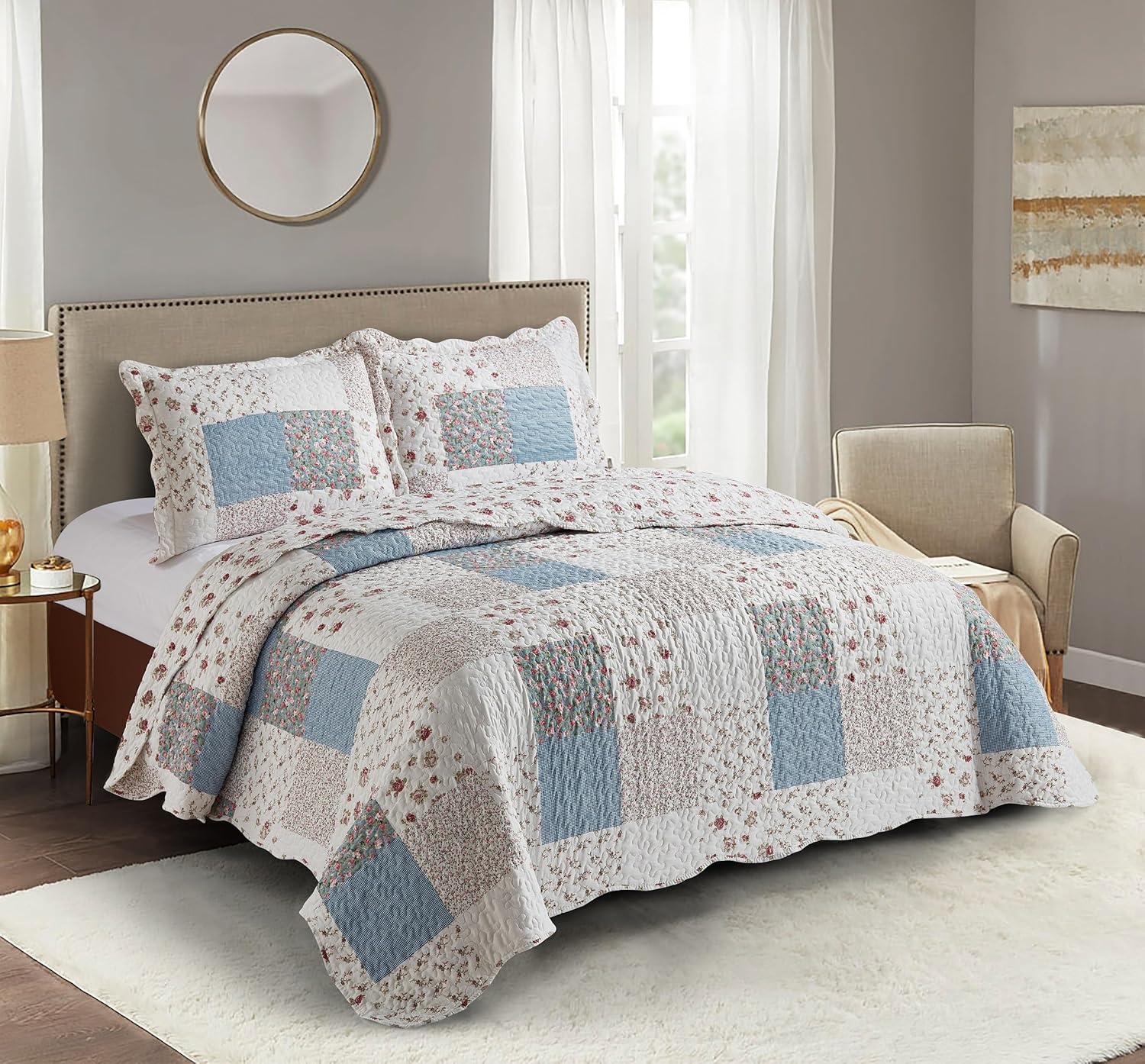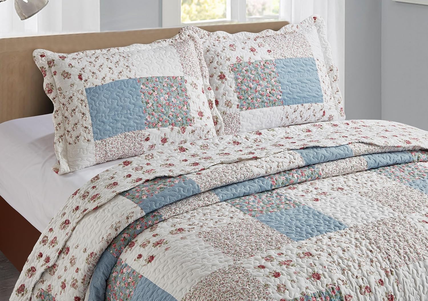 Brilliant Sunshine Pink Rose with Small Blue Check Patchwork, 3-Piece Quilt Set with 2 Shams, Reversible Bedspread, Soft Lightweight Coverlet, All-Season, Full/Queen, Pink Blue