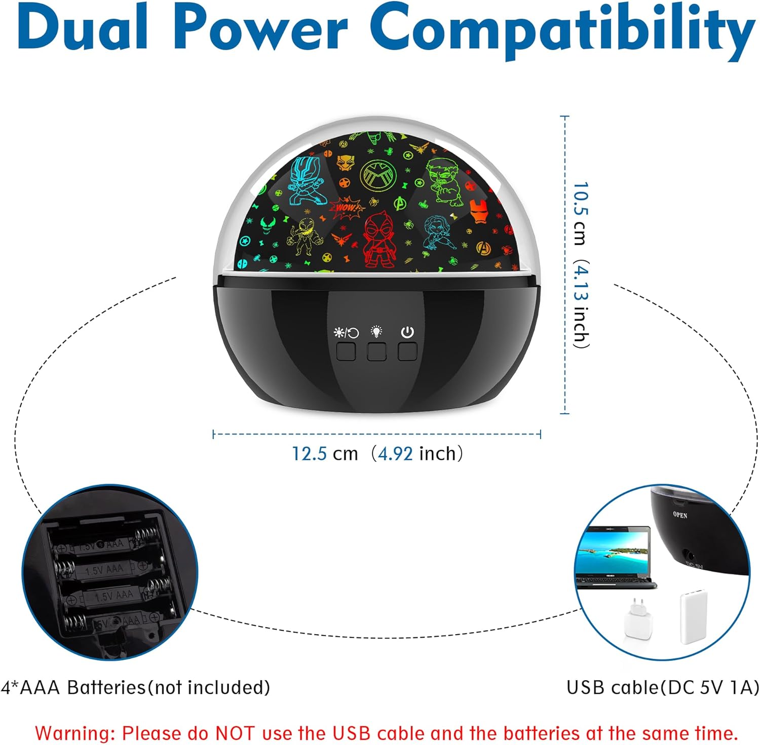 - Dual Power Options: Powered by a USB cable (compatible with computers and power banks) or 4 AAA batteries (not included). Do not use USB and batteries simultaneously. We recommend using USB power for safety, preventing kids from playing with batteries
