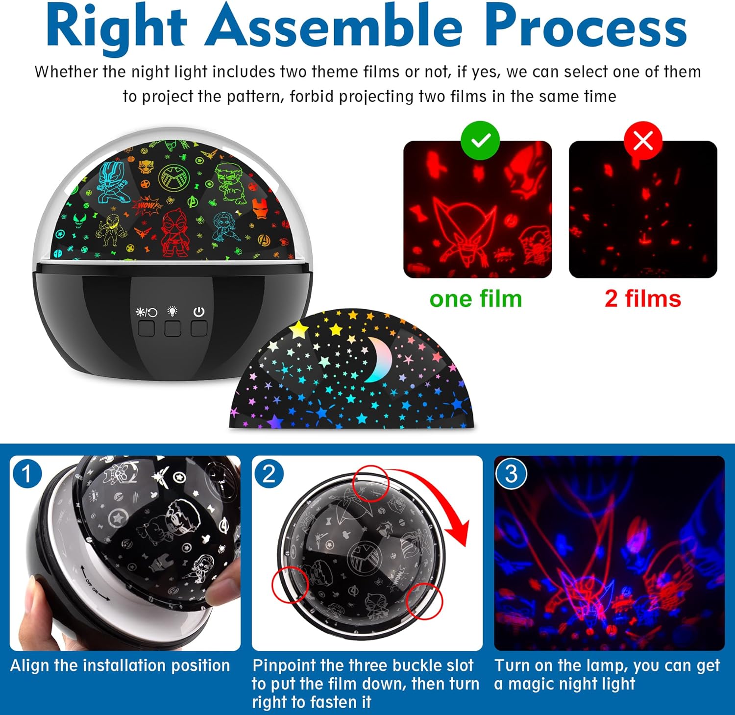 - Two Film Themes to Select: a cool superhero theme and a fantastic starry moon theme, our kids can change it freely. it brings joy and wonder to your child's space. it can decorate the baby's room, nursery, and bedroom decoration. It can accompany boys and girls in growing up to overcome the scare of darkness, best gift for little baby
