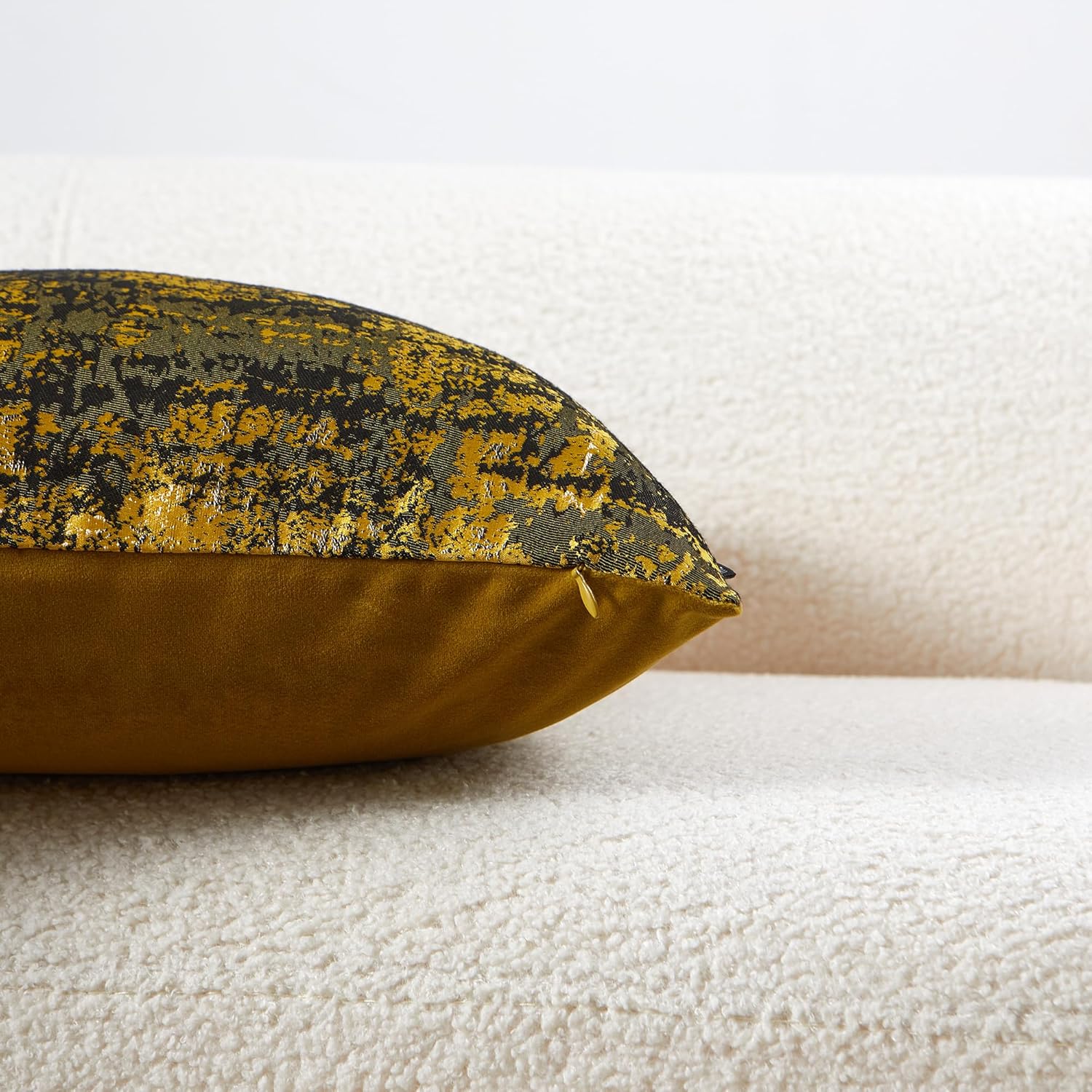 - Premium Jacquard & Velvet Pillow Cover : Crafted with luxe 70% polyester 30% viscose jacquard weave in Sun Gold & Black - a striking interplay of warm metallic gold and rich onyx threads that creates a contemporary luxe glow. The reverse features 100% polyester cream beige velvet in sumptuous cloud-soft texture. Two looks in one - Instantly elevates sofas, beds, or accent chairs—perfect for holiday glamour or everyday luxury.