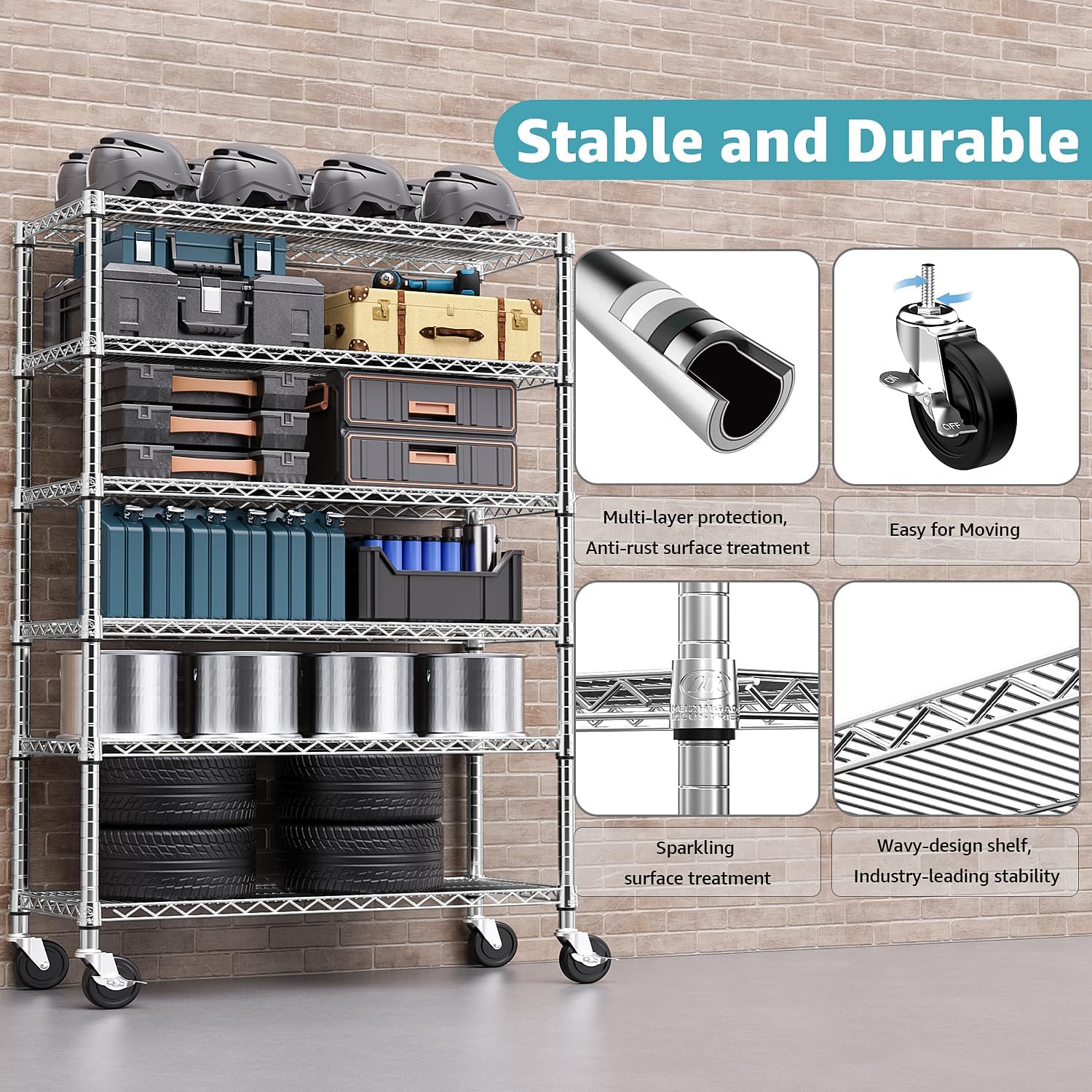 - 【STABLE AND DURABLE】Crafted from premium Carbon Steel and reinforced with 25.4mm pipes, this wire shelving unit (17.7"D x 47.2"W x 76.7"H ) ensures stability. Each shelf showcases a weight-bearing capacity of 680 pounds, while the entire unit can support up to 4080 pounds on feet/600 pounds on wheels.