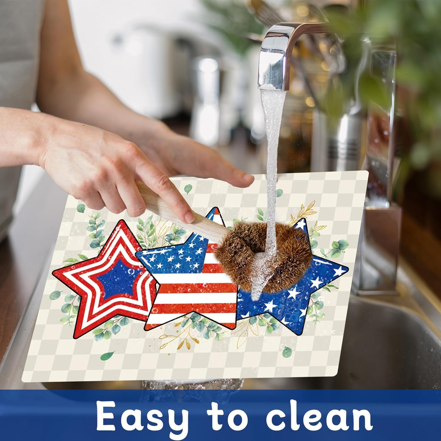 - Thoughtful design: A set of 6 plastic table placemats, each with four rounded corners protects you from being hurt by the sharp angles. The design of the 4th of July plastic kitchen dining placemats incorporates elements of the eucalyptus and American star, with the words "America", "Freedom", and "Blessing" on it. Impress your guests and create an unforgettable and warm atmosphere for your party.