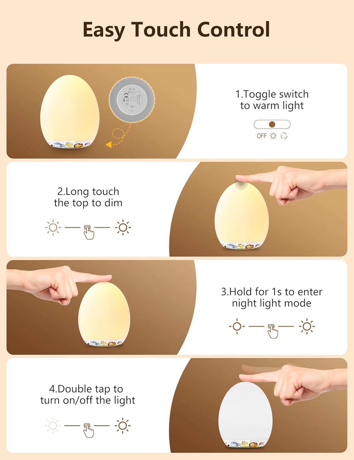 - Easy Touch Control: Long press the top for stepless dimming; Tap the top twice to turn on/off the light; hold the top 1.5s to enter night light mode for late night feeding and diaper changings