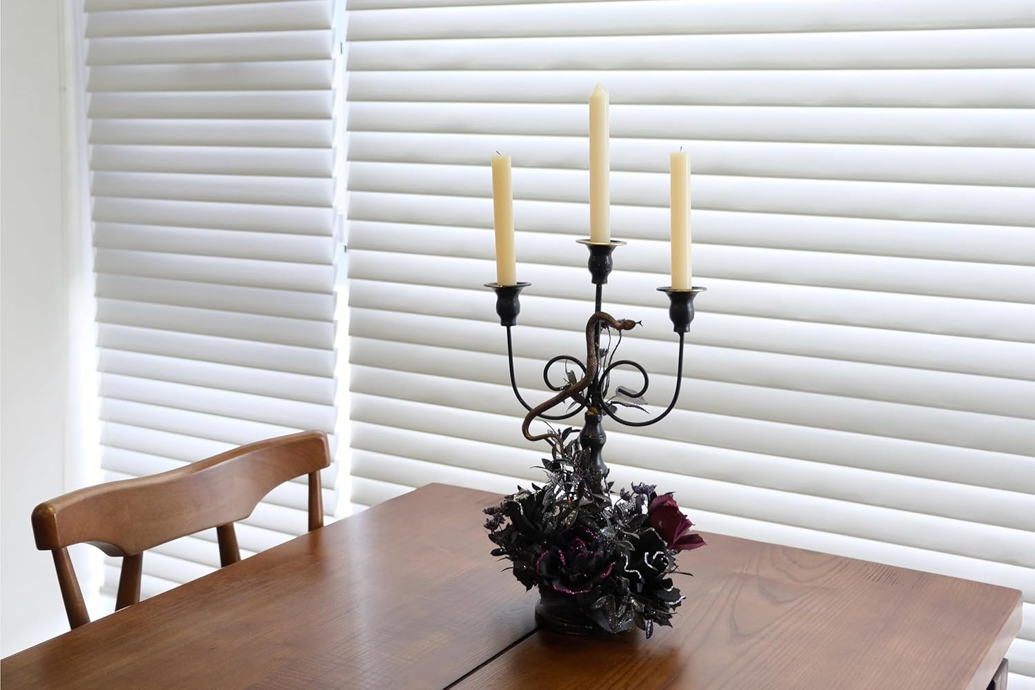 • Elegant and Spooky Design: This black metal 3-arm candelabra, adorned with high-quality artificial flowers, leaves, and a small snake, is perfect for Gothic home decor or as a Halloween table centerpiece