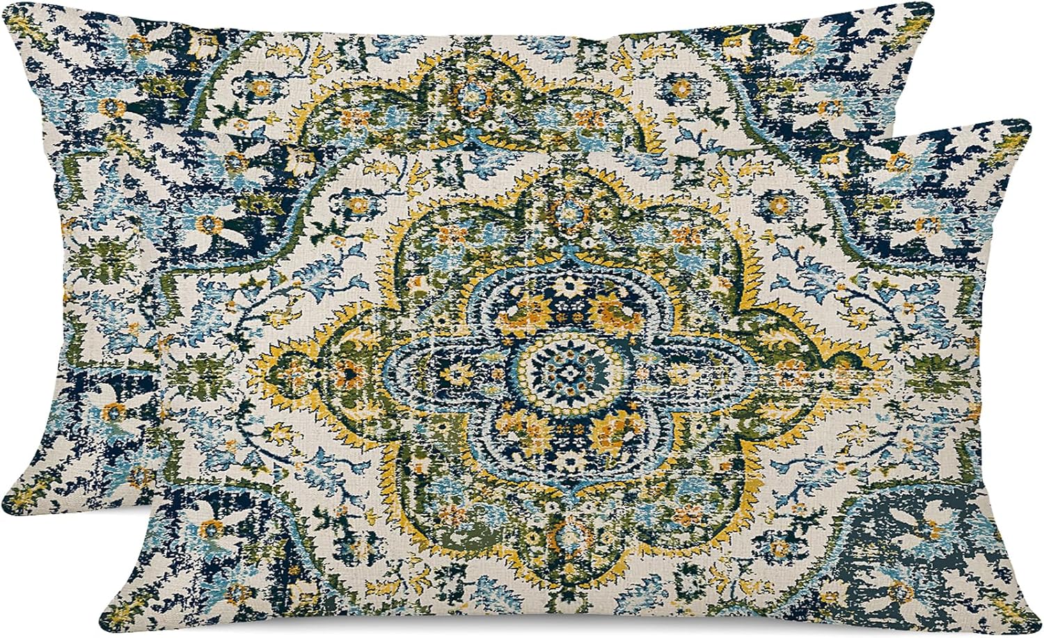 Outdoor Waterproof Pillow Covers 12X20 Set of 2 Bohemian Vintage Carpet Pattern Pillow Covers Green Blue Ethnic Design Decorative Farmhouse Cushion Case for Couch Garden