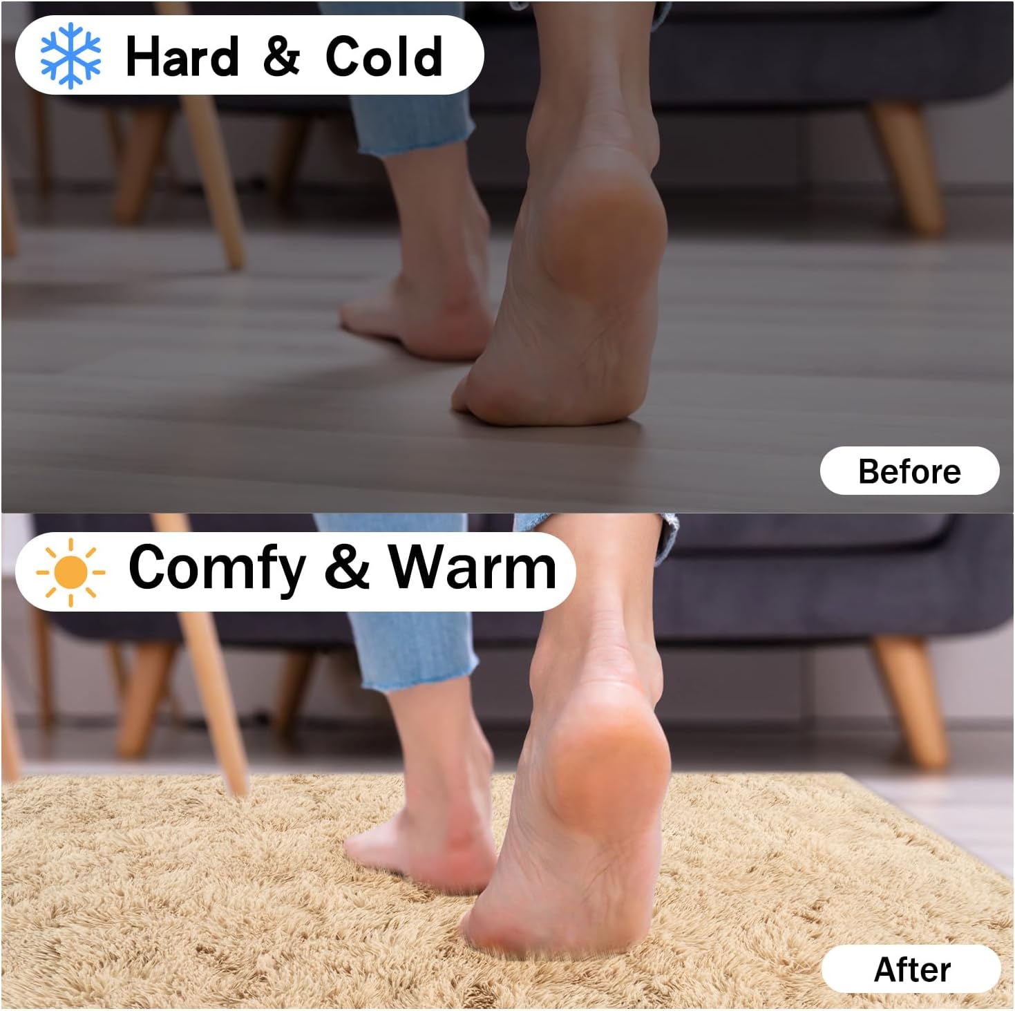 - Rezutan Area Rugs-Soft Fluffy Rug:The Rezutan shag area rug is crafted from durable microfiber, ensuring a plush and incredibly comfortable experience. Its 1.7-inch high pile surface is dense and velvety to the touch, while the 0.3-inch memory foam provides superior cushioning, isolating you from the cold ground and offering soundproofing benefits. Because of the plush fur on the Soft Fluffy rug, youโll feel like walking on the clouds when walking barefoot on the large bedroom rugs.