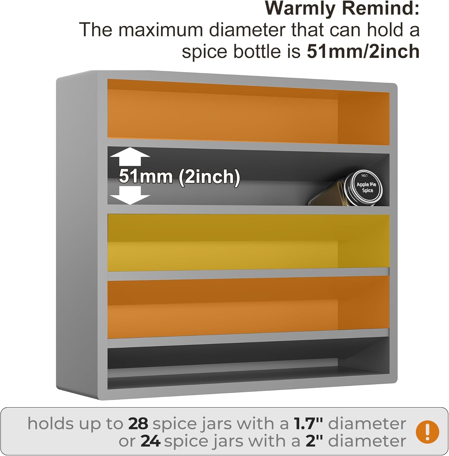 - Warmly Remind: The maximum diameter that can hold a spice bottle is 51mm/2inch.