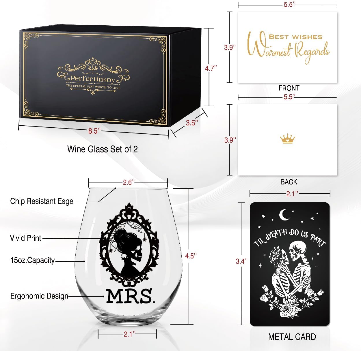 Perfectinsoy Skull Wine Glass 2 Piece with Gift Box, Zombie Design, Valentine's Day Autumn Halloween, Anniversary Wedding Gifts, Couple Gifts for Boyfriend and Girlfriend. (Mrs Mr Set of 2)
