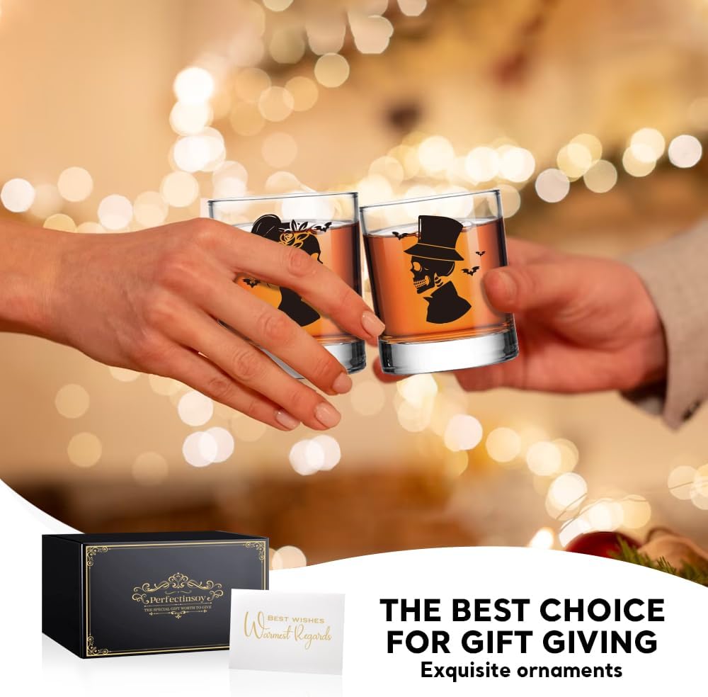 Perfectinsoy Skull Whiskey Glass 2 Piece with Metal Card, Couple Skull Gothic Design, Anniversary Wedding Gifts, Couple Gift for Boyfriend and Girlfriend, Valentine's Day Fall Halloween