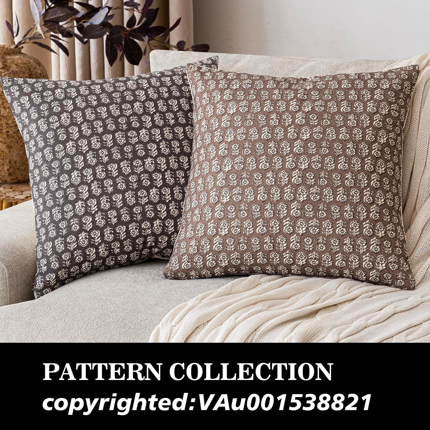 Foindtower Set of 2 Decorative Neutral Floral Print Throw Pillow Covers Vintage Accent Farmhouse Cushion Covers Boho Home Decor for Sofa Couch Chair Bedroom Living Room Outdoor,22×22 Inch,Brown