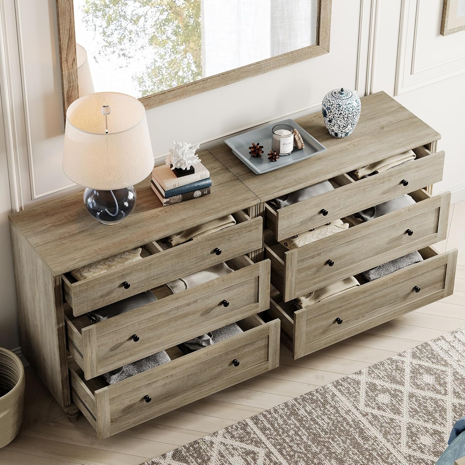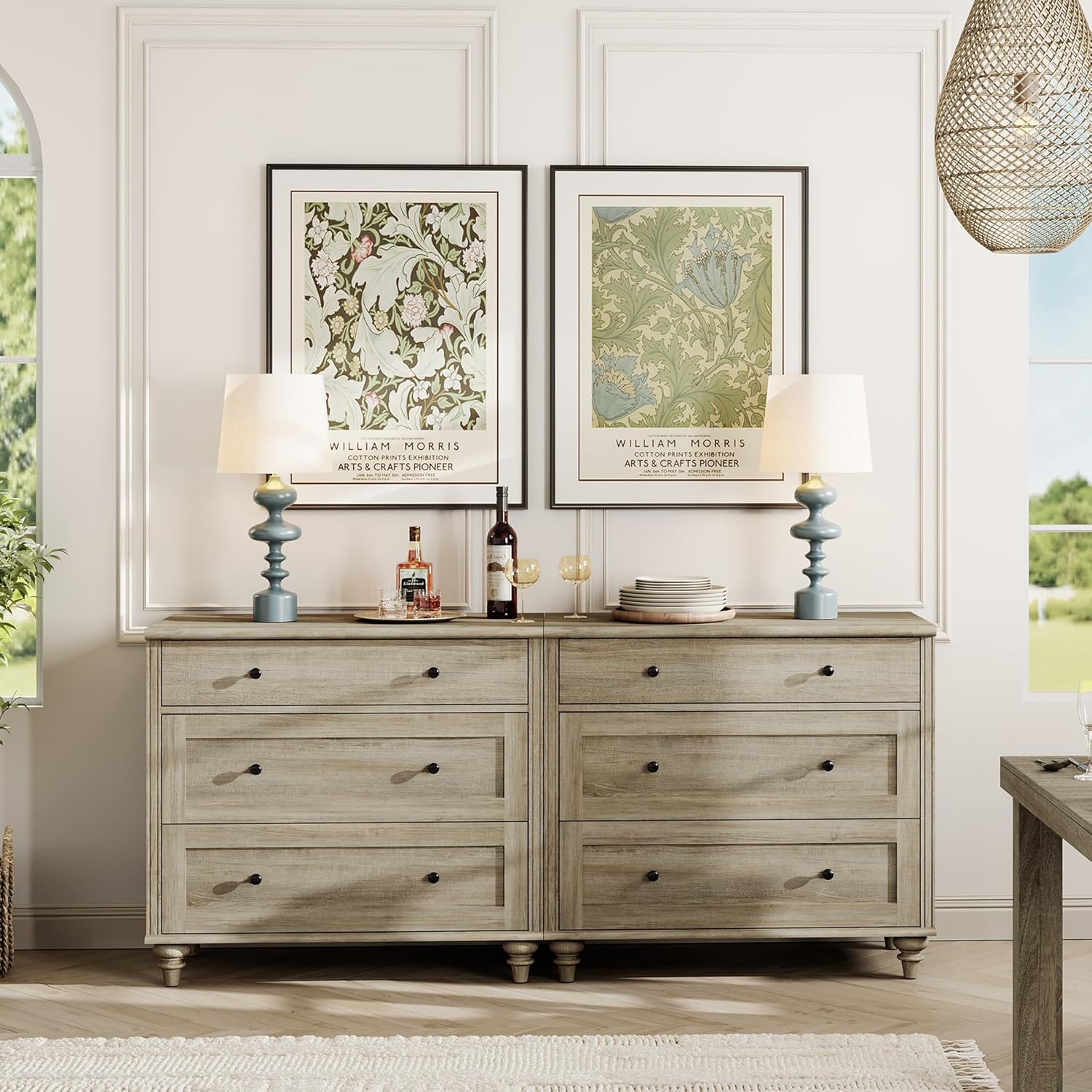 - 【2-in-1 Multipurpose Dresser】The 2-in-1 large dresser can be used together as 6 drawer dresser or tv stand for 75 inch tv, or used separately as two 3 drawer dressers.With distresser suface is very classic and elegant which blends in easily with any decor. It is ideal as a baby dresser, kids dresser and console table, etc.