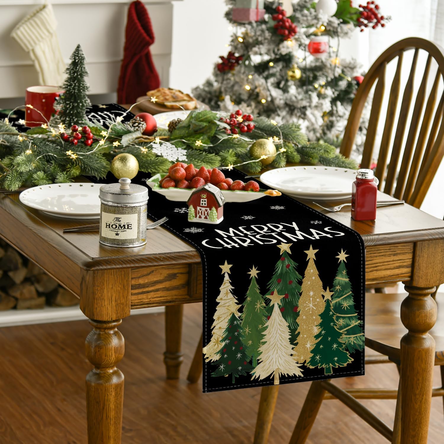 Artoid Mode Xmas Trees Snowflakes Black Merry Christmas Table Runner, Winter Seasonal Kitchen Dining Table Decoration for Home Party Decor 13x72 Inch