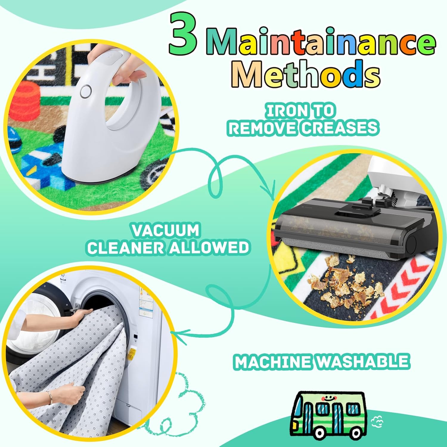 - [Machine Washable Kids Play Rug]: This car rug for kids toy cars measures 4 x 6 feet/48*72 inches. 0.4'' thick. Our mat is easy to clean by vacuum or machine. Perfect bedroom rug, living room rug, and playroom rug.