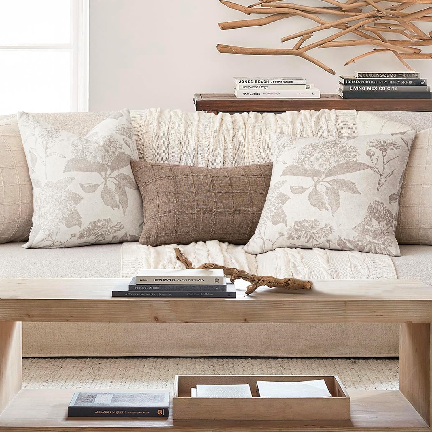 Foindtower Set of 2 Linen Floral Vintage Throw Pillow Covers Neutral Accent Decorative Cushion Covers Farmhouse Boho Home Decor for Sofa Chair Couch Bedroom Living Room Outdoor,20×20 Inch,Tan Beige