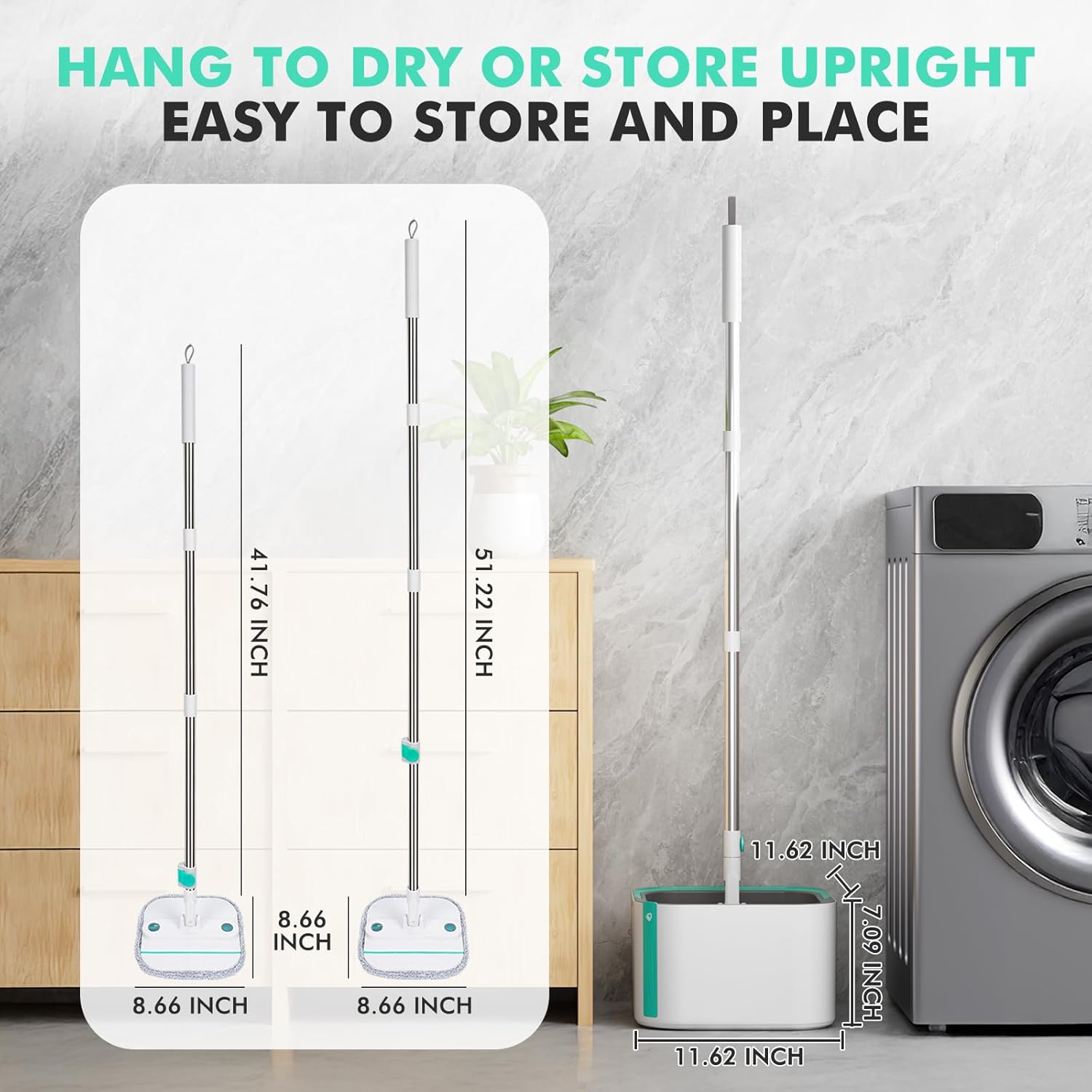 - 【Upgraded Foldable Mop Plate】One side of the mop plate folds up at a 90-degree angle, while the square mop head rotates 360 degrees. This design allows for easy cleaning under furniture, in corners, along baseboards, and around window and door frames. Each self-standing mop and bucket set includes 2 machine washable microfiber mop head replacements, perfect for hardwood floors, tiles, and marble.