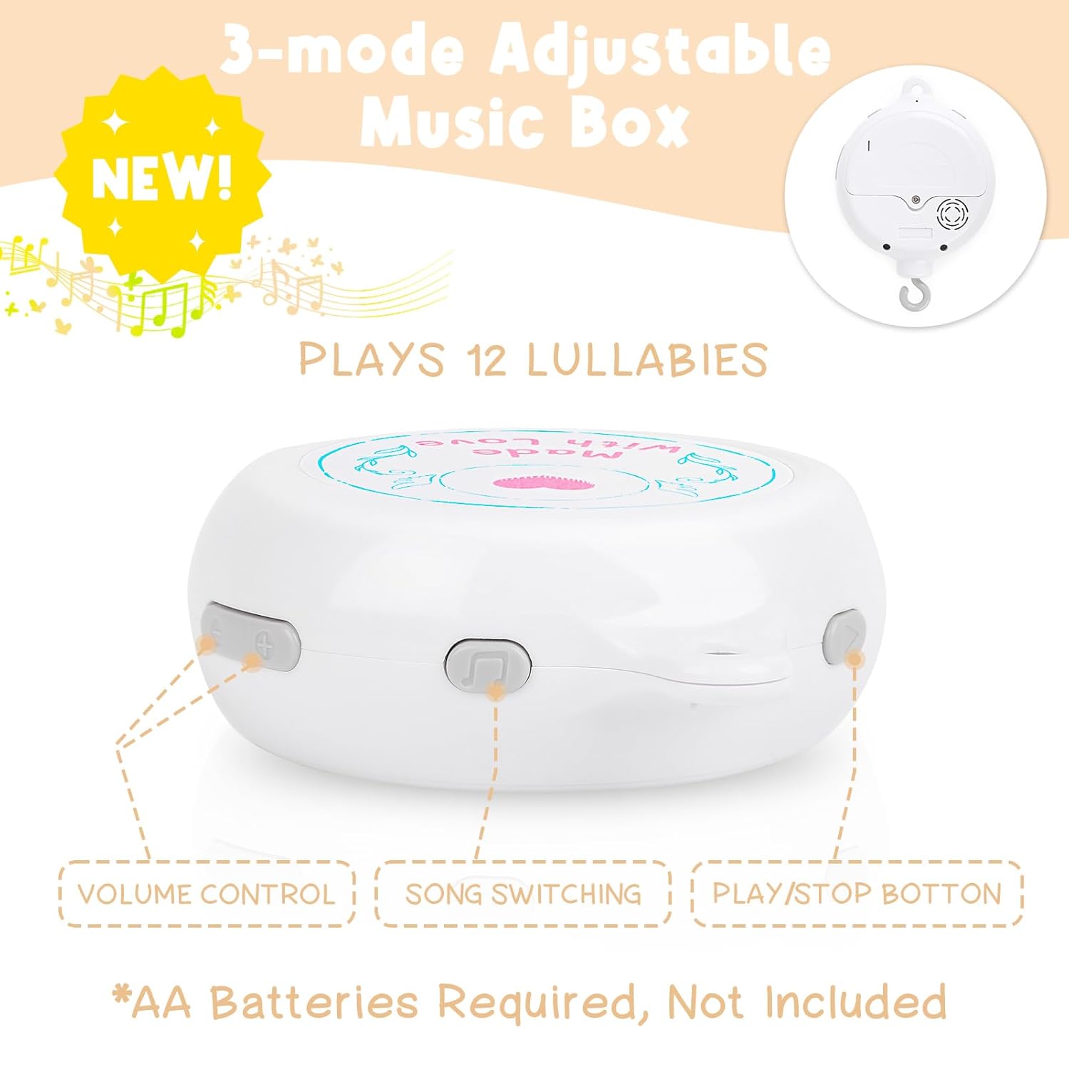 - 12 Soothing Lullabies: The newly upgraded 3-mode adjustable music box lets you choose between Rotation Only, Music Only, or Both. As the gentle melodies play, the toys slowly spin, creating a calming atmosphere that makes bedtime a smoother and more enjoyable experience for both baby and parents
