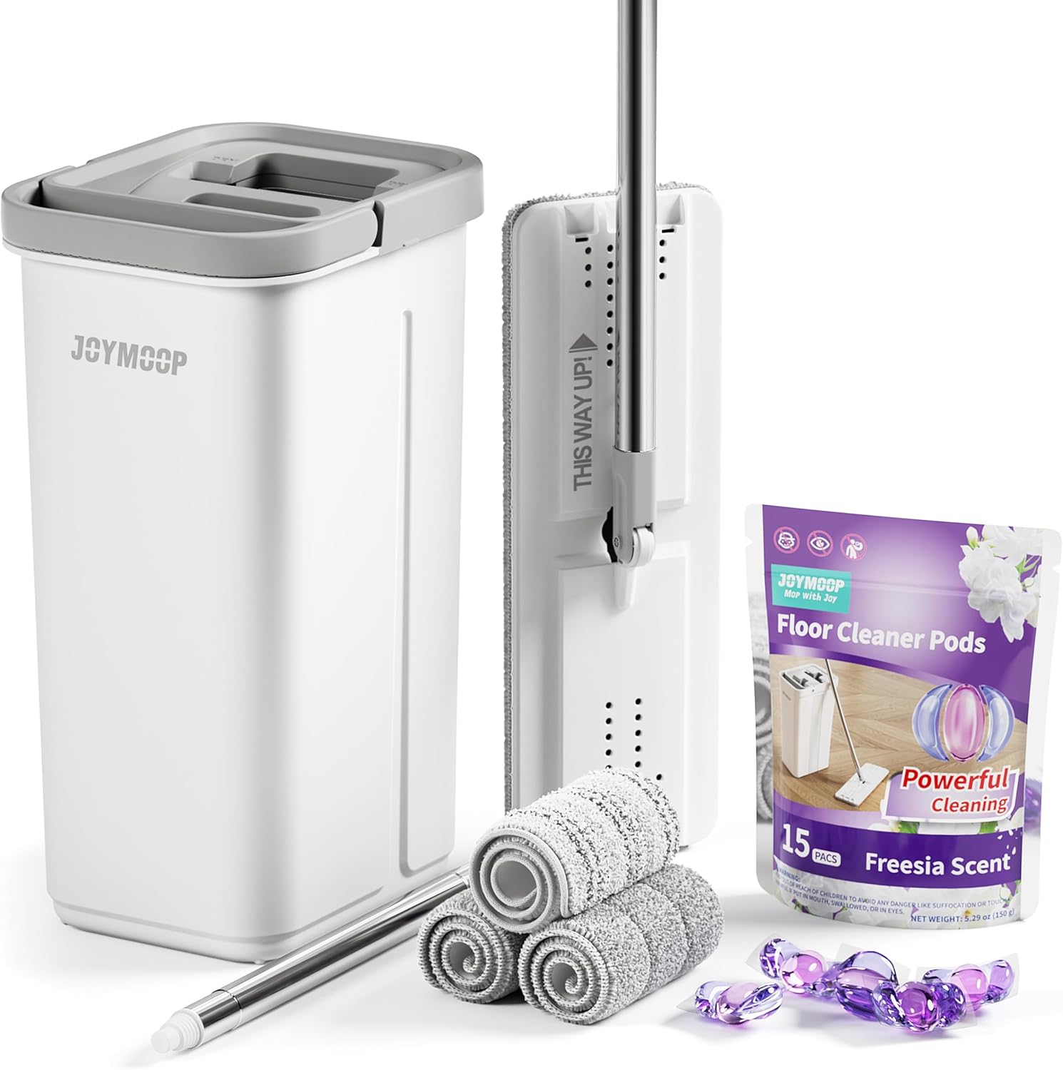 - [ALL-IN-ONE CLEANING SOLUTION] Bundle includes a JOYMOOP flat mop and bucket with wringer, plus 15 floor cleaner pods in freesia scent for an ultimate cleaning experience