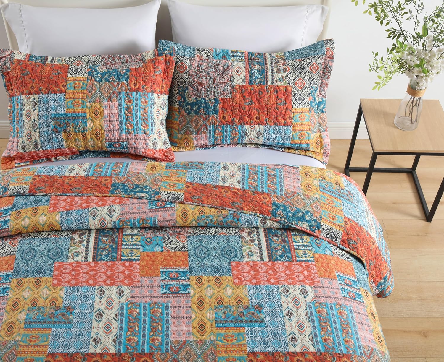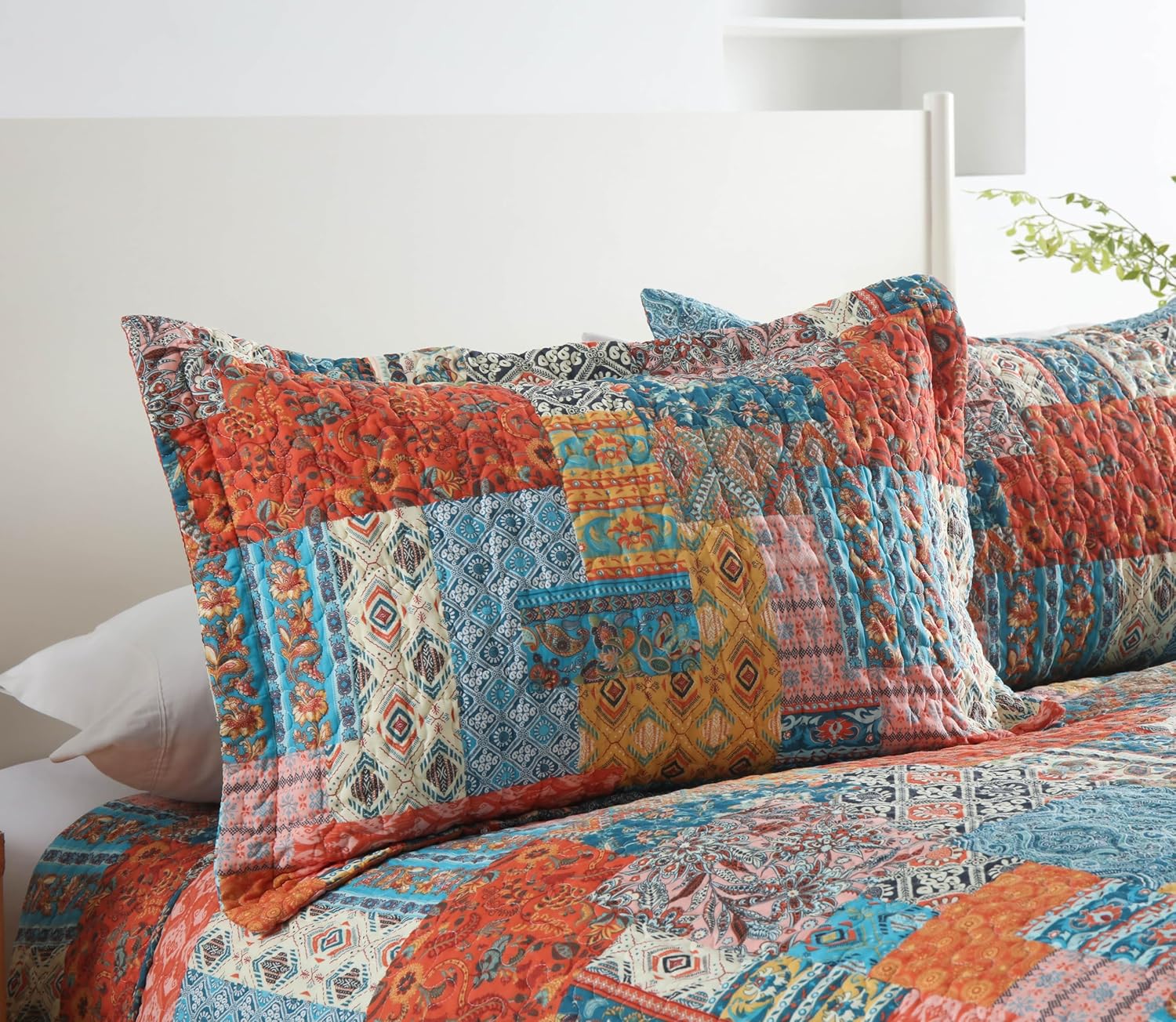 - Vintage orange and blue bohemian patchwork pattern making your room more elegant and charming, creating a wonderful bedroom space