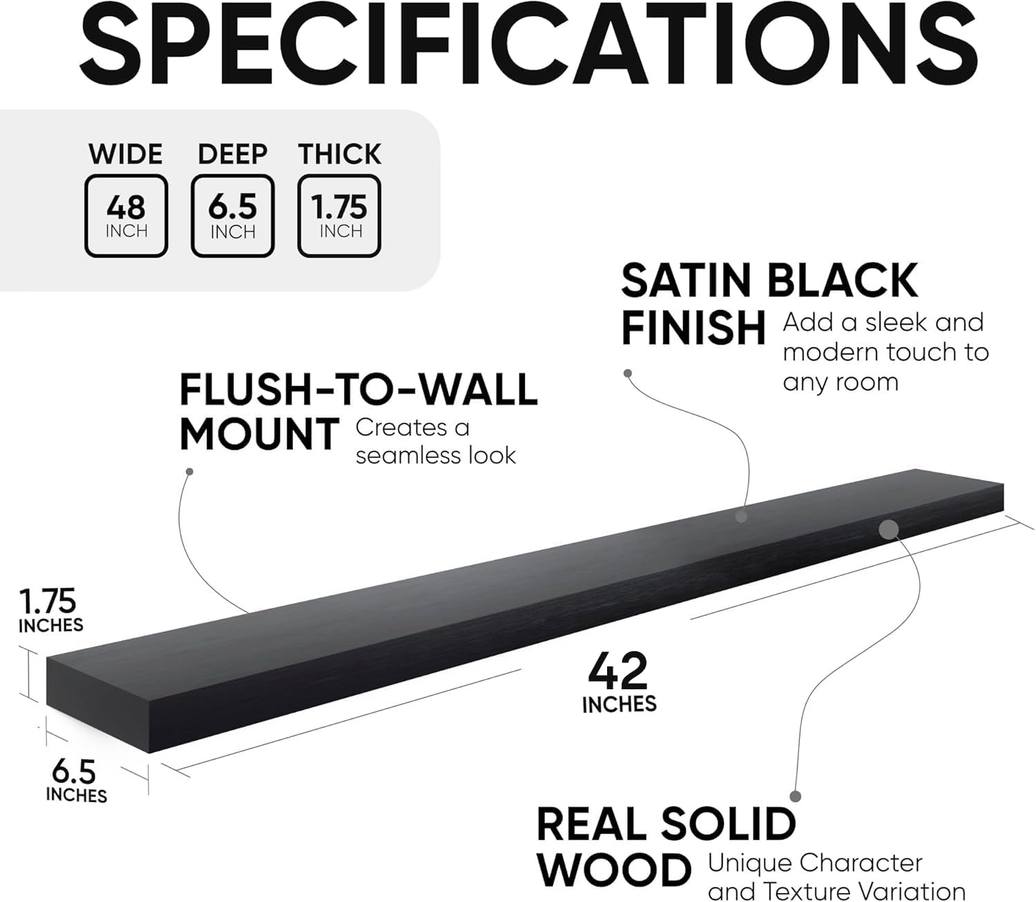 Homeforia Floating Black Shelf 42 inch, High End Solid Real Wood 42 inches Long Floating Shelves for Wall, Black Wooden 42inch Large Floating Shelves, Heavy Duty Bracket, 42 X 6.5 X 1.75 in, Set of 2