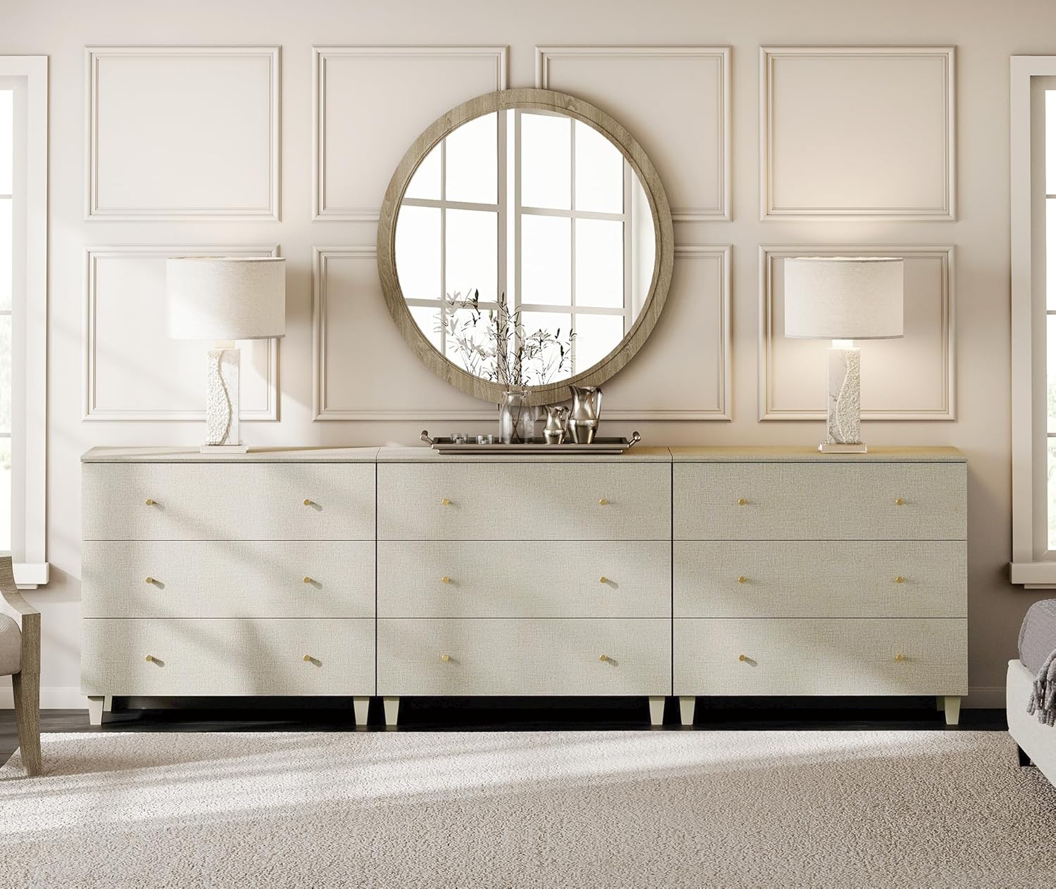 - 9-Drawer Dresser: There are 9 wide wooden drawers that slide easily on ball-bearing sliders, the gold-coated metal knobs allow you to push and pull the drawers without effort, keeping your clothes or other items neat and tidy. 106.2"x15.35" wide tabletop also provides ample storage space to display family photos, plants, books, or other daily items; Note: In order to pass the anti-tip test, the drawers can be pulled out around 7.48 inches at most