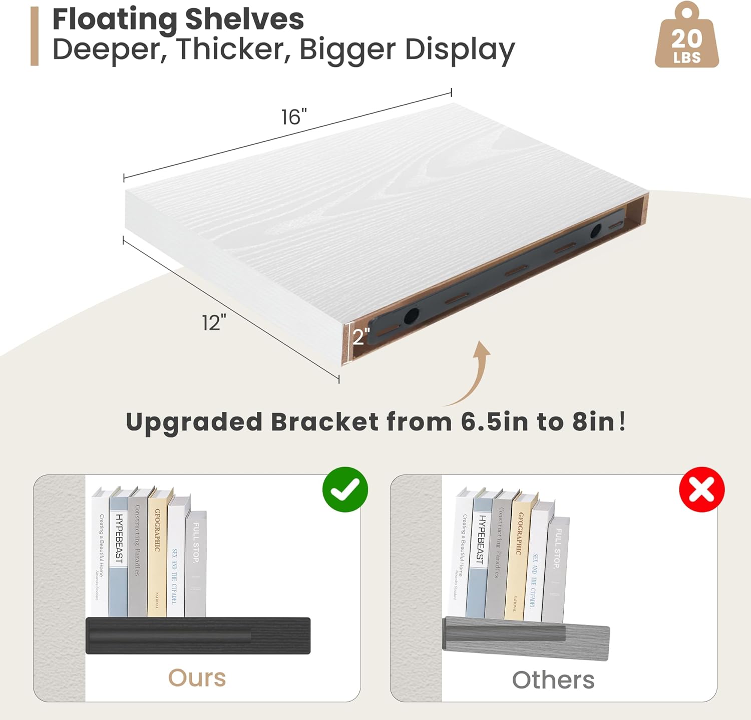 Heimlove 12 Inch Deep Floating Shelves, 16 x 12 inches Long Wall Shelf, Large Extra Display Shelf & Storage Shelf, Rustic Wood Wall Shelves for Fireplace Mantel, White - 2Pack