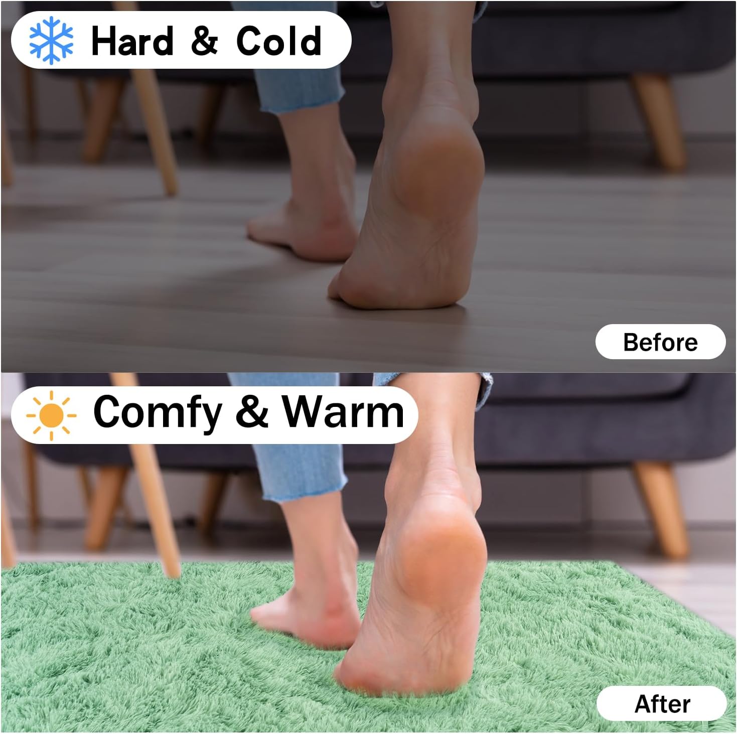 - Rezutan Area Rugs-Soft Fluffy Rug: The Rezutan shag area rug is crafted from durable microfiber, ensuring a plush and incredibly comfortable experience. Its 1.7-inch high pile surface is dense and velvety to the touch, while the 0.3-inch memory foam provides superior cushioning, isolating you from the cold ground and offering soundproofing benefits. Because of the plush fur on the Soft Fluffy rug, you’ll feel like walking on the clouds when walking barefoot on the large bedroom rugs.
