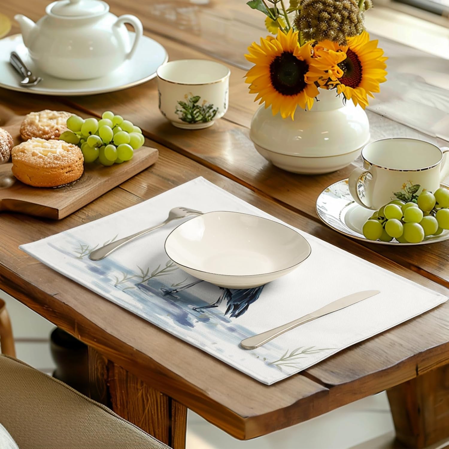 - TABLE DECORATION: Summer coastal placemat feature high-definition printing technology for crisp, clear patterns and vibrant colors; rectangle placemats with a heron pattern; unique and eye-catching seasonal patterns add charm to farmhouse table place mats, creating a spring and summer atmosphere for your party
