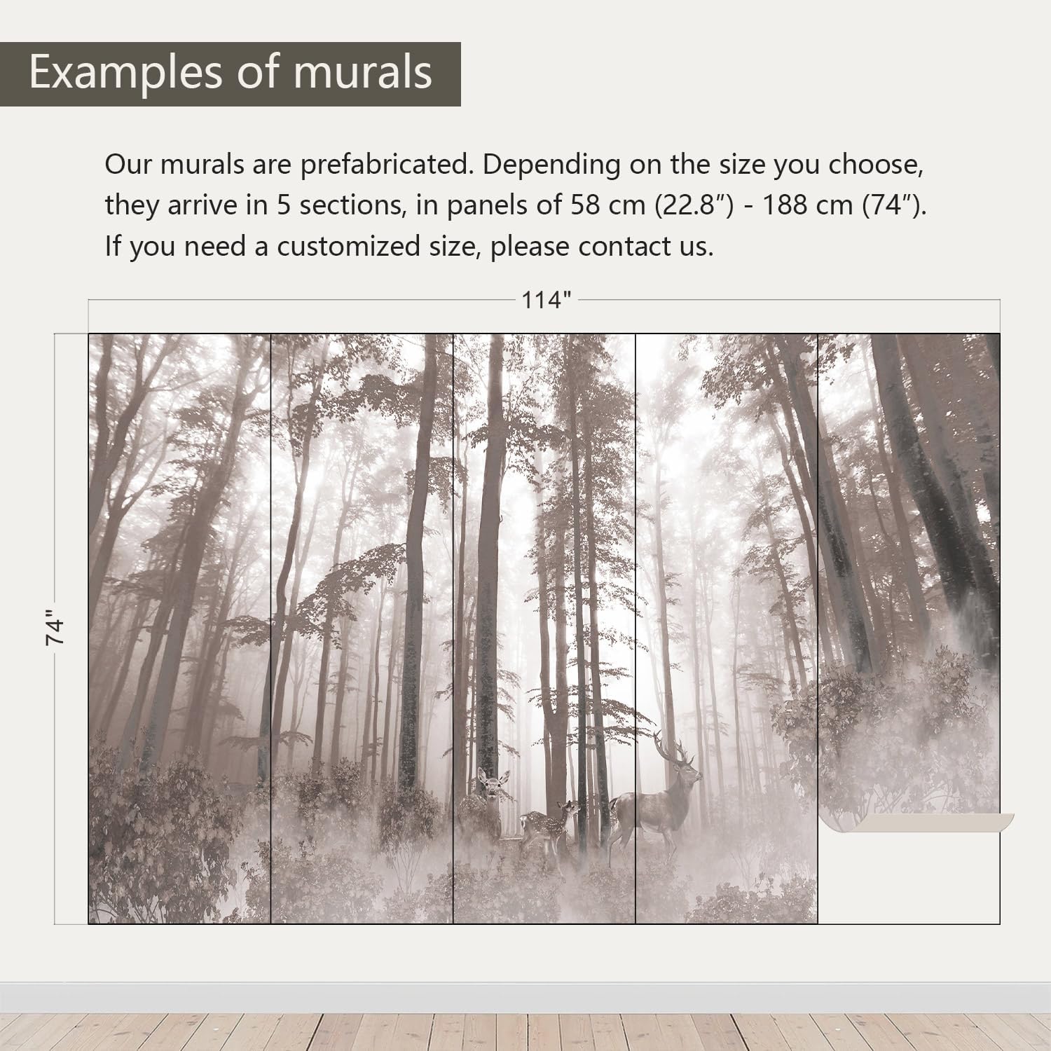 - Size note: Mural measures 114"W x 74"H and is divided into 5 sections, each section is labeled with a number underneath, eliminating the need to overlap patterns when installing.