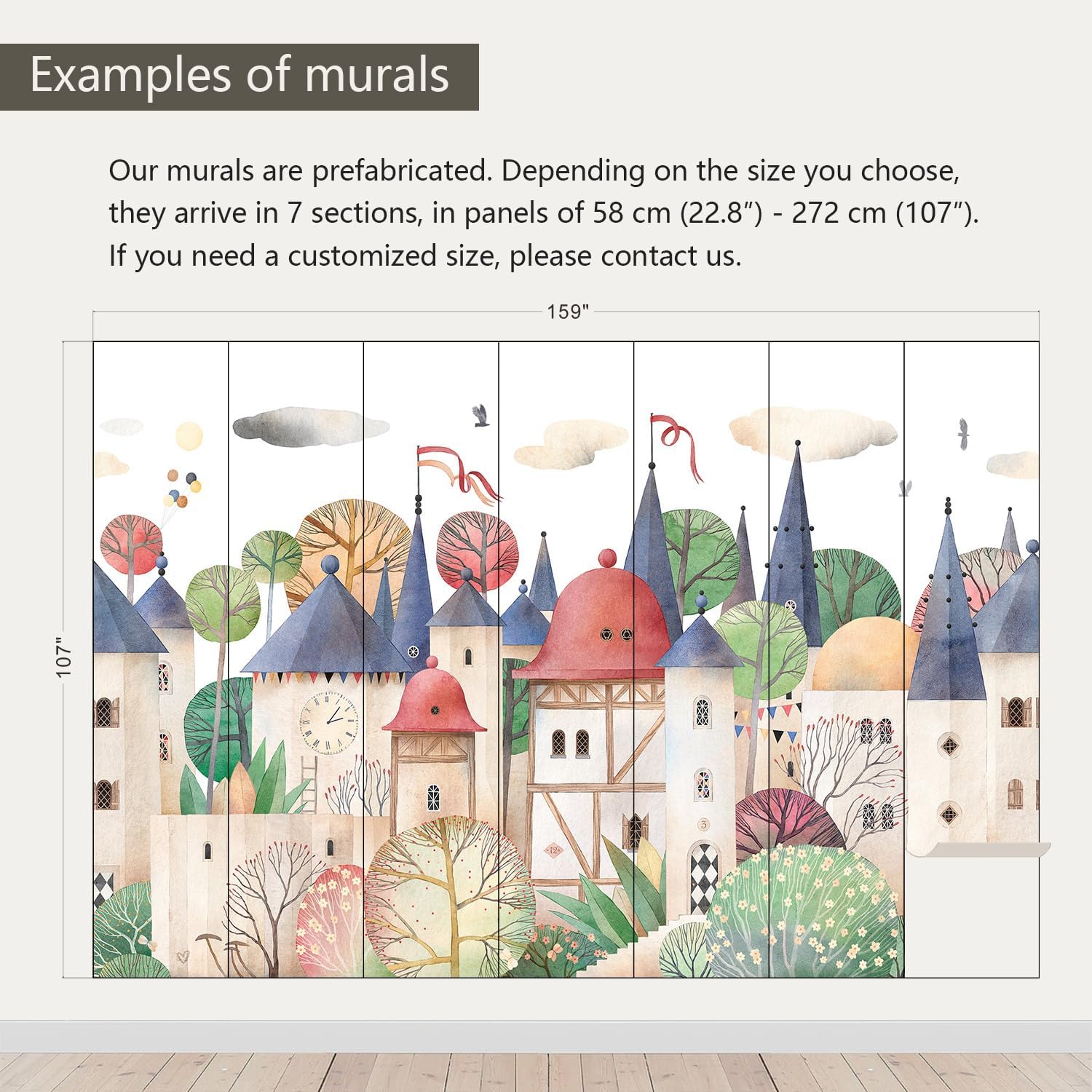 - Size note: Mural measures 159"W x 107"H and is divided into 7 sections, each section is labeled with a number underneath, eliminating the need to overlap patterns when installing.