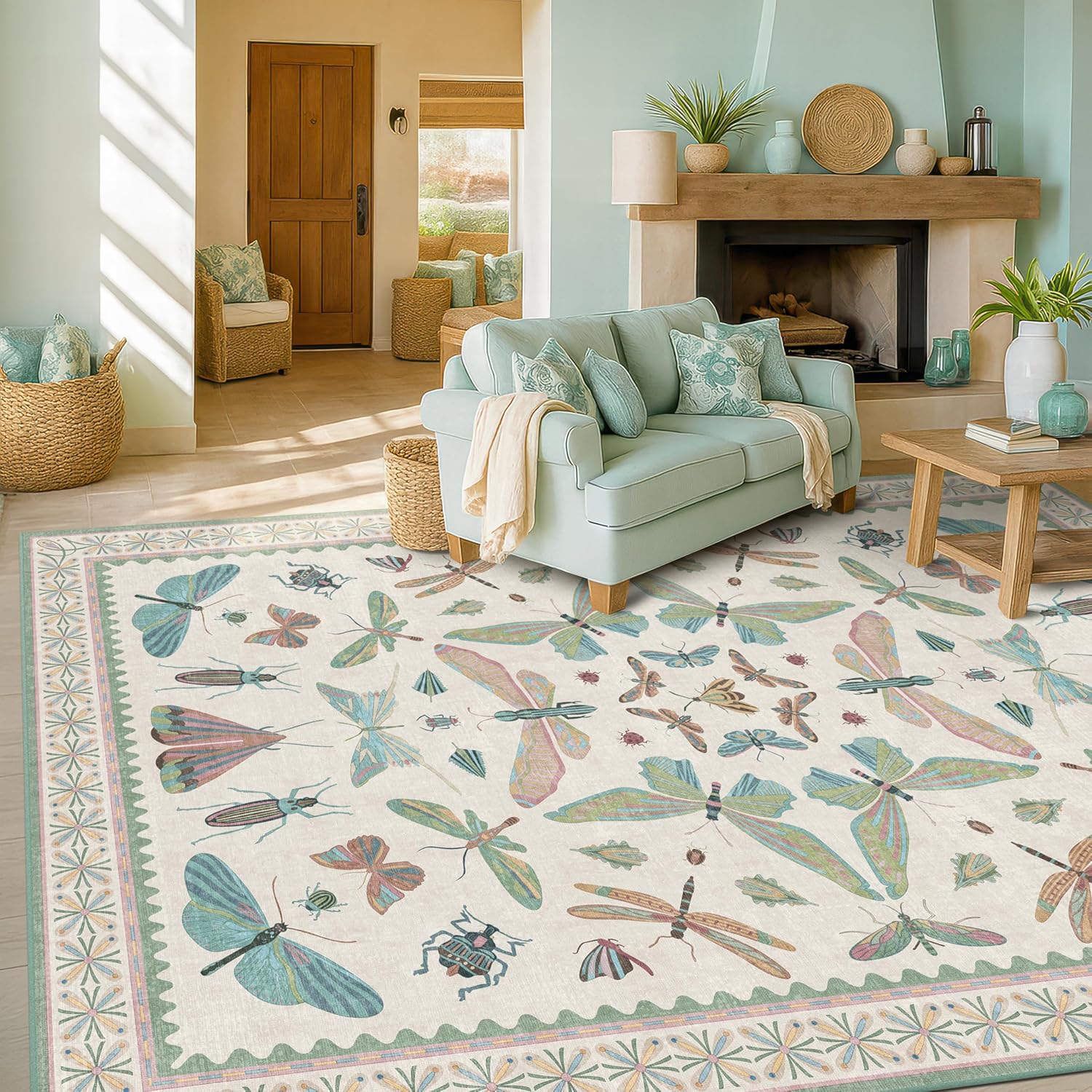 Sage Green Rugs for Bedroom Under Bed - 6x9 Area Rug for Living Room, Dining Room, Kids Playroom, Fun Insect Cute Décor,Ultra Soft Non Slip Stain Resistant