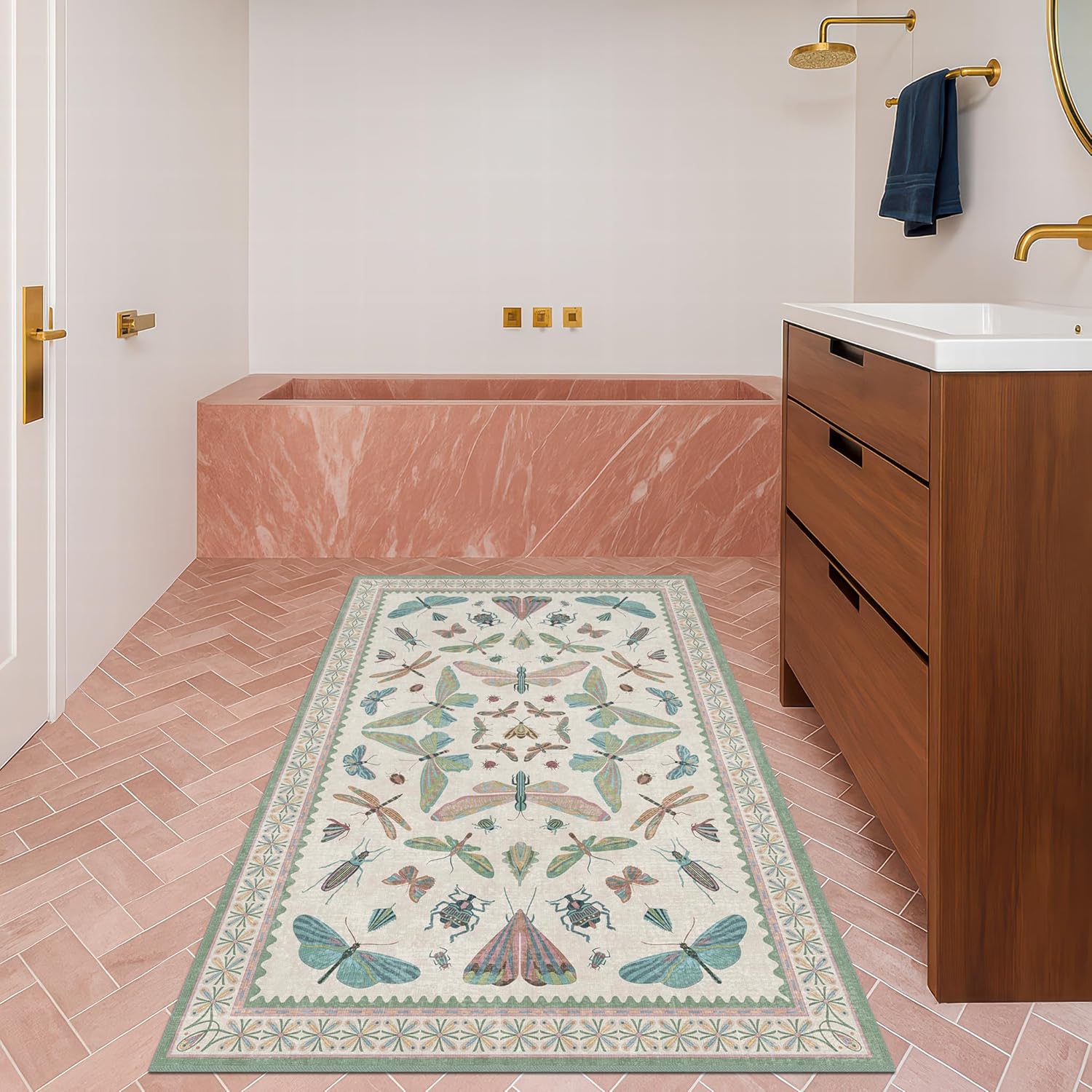 Washable Sage Green Large Entryway Rug, 3x5 Area Rugs for Laundry Room, Kitchen, Bedroom, Dorm, Insect Print Vintage Floral Non-Slip Throw Rug Low Pile Stain Resistance