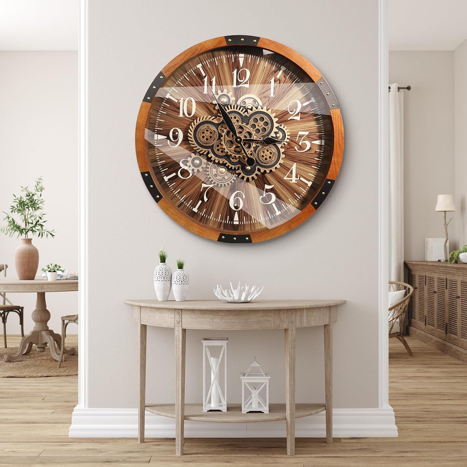 Wall Clocks for Living Room Decor, Large Real Moving Gears Clock, Vintage Industrial Oversized Rustic Farmhouse Kitchen Office Fireplace Wall Decor (Brown, 27 inch)