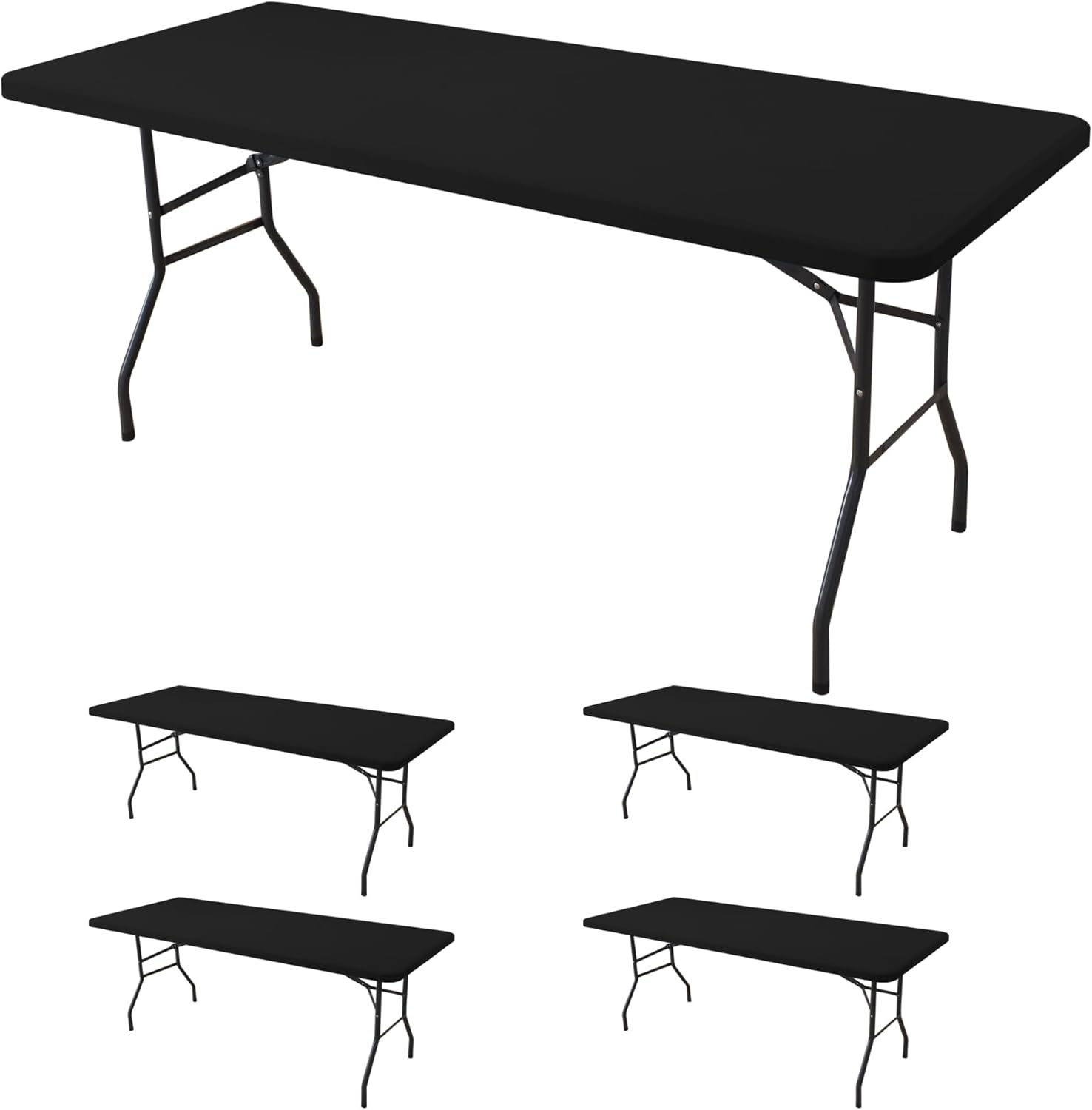 - Multi-Size Stretchy Spandex Fitted Table Covers: 90% polyester and 10% spandex, this wrinkle-free and stretchable fabric is also durable, elastic, and stain-resistant. Each set includes 4 pieces, each precisely sized to fit 8 ft rectangular folding tables ranging in length and width from 26''W x 92''L - 34''W x 100''L (ideally 30''W x 96''L), ensuring a snug and perfect fit.