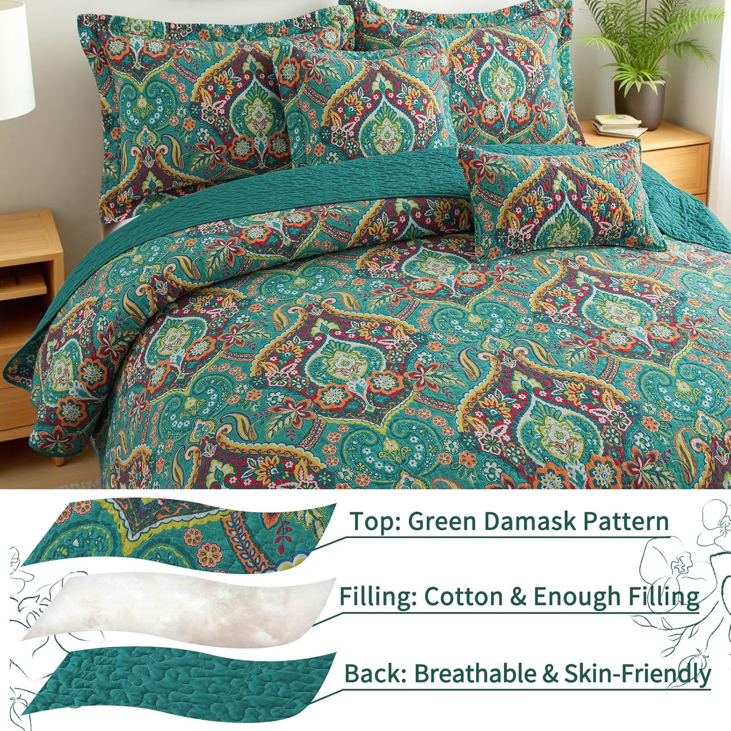 - 【3-Layer All-Season Comfort】 Cotton king size quilt are composed of three layers, floral bedding woven cover, inner cotton filling, and solid color woven backing. Three layers of farmhouse king size quilts for bed are stitched together with fine handwork, trapping warmth in winter and breathable in summer for year-round coziness.