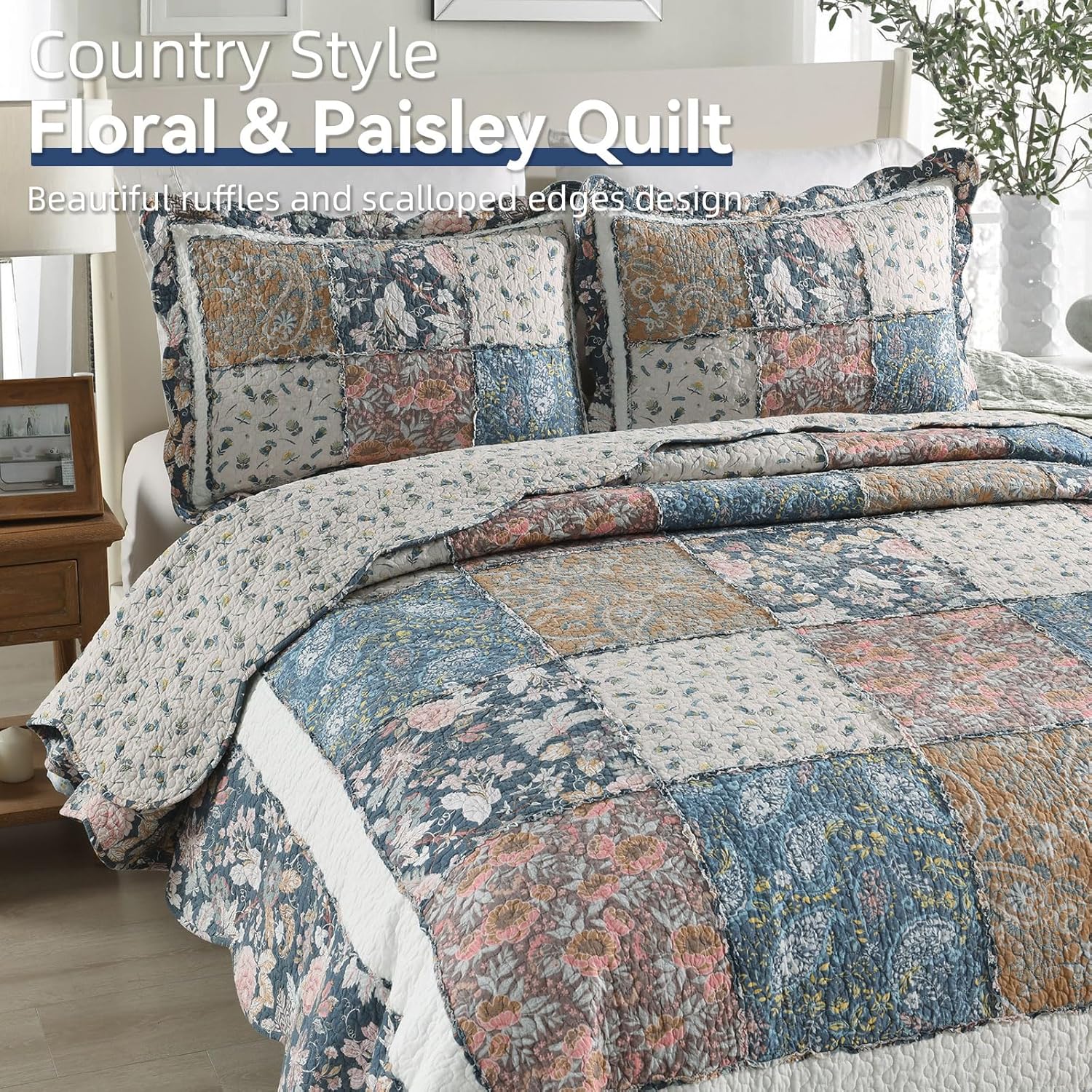 - BEAUTIFUL QUILT SET: Country style blue floral and paisley patchwork with ruffles; The real patchwork quilt set is stitched with beautiful floral and paisley patterns pieces and with delicate ruffles on it. The quilt set is reversible and lightweight. Its another side is designed with floral spots on it. Combined with unique floral and paisley elements and elegant colors, the queen bedspread will bring your room a fresh look.