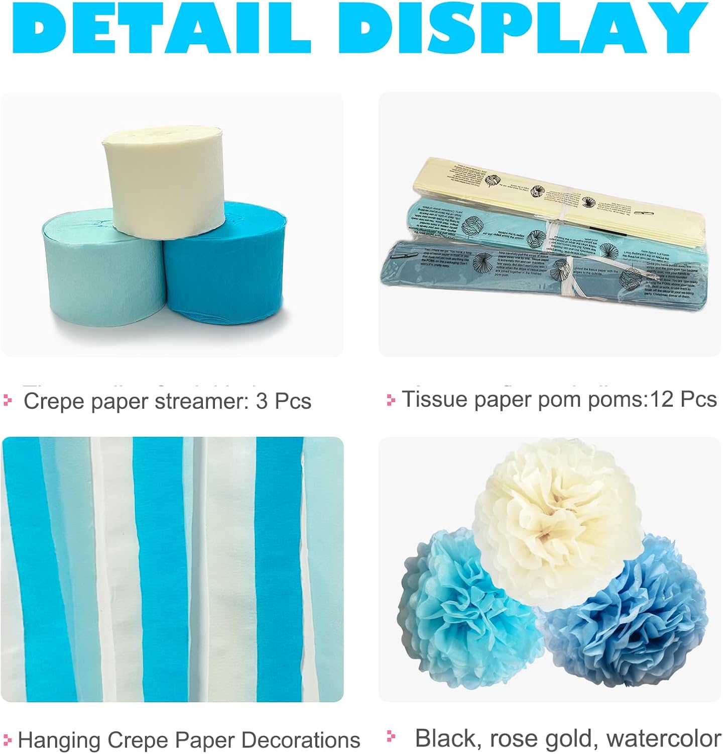 Blue Party Streamers Decorations Paper Pom Poms Fringe Backdrop for Wedding Decor, Birthday, Bachelorette, Baby Shower, Party Backdrop
